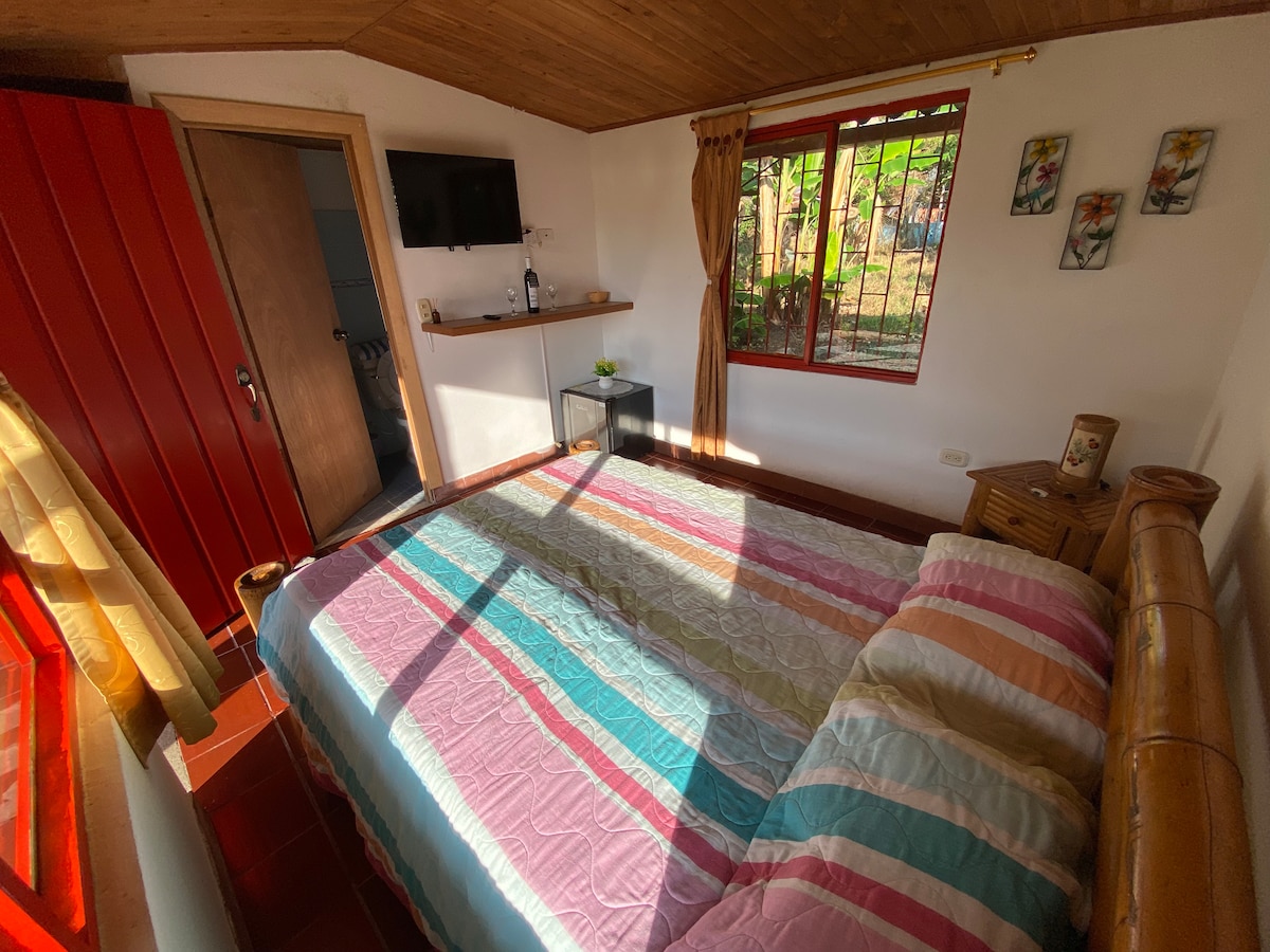 Sumérgete en la serenidad de nuestra habitación doble con capacidad para tres personas, un refugio ideal para descansar y escapar de la rutina. Situada en un entorno campestre, esta confortable estancia te brinda el descanso que necesitas, rodeado de naturaleza, aire fresco y paisajes relajantes. Disfruta de: Piscina al aire libre. Espacios comunes con cocina equipada. Áreas verdes y zonas de descanso, donde la melodía de los pájaros y la suave brisa harán de tu estancia una experiencia única.