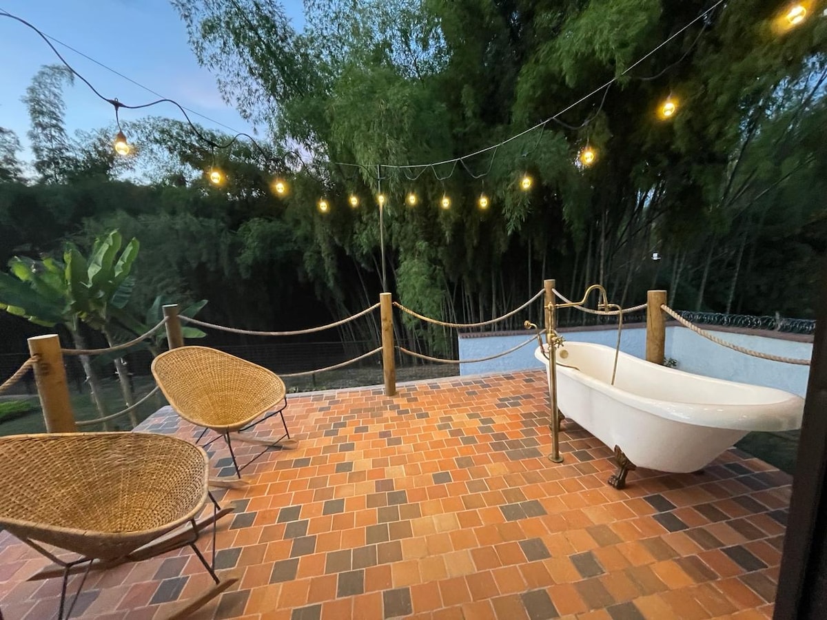 Disfruta de una experiencia con estilo en un lugar magico aislado del ruido de la ciudad, regálate para ti y tu pareja una desconexión del estrés cotidiano y reconecta con la naturaleza en un ambiente de privacidad, relajación y elegancia. En nuestro glamping podrás disfrutar: 🛁Jacuzzi privado con vista a la naturaleza. ☕cocina con refrigerador y elementos basicos. 🚘 parqueadero totalmente gratuito en el sitio. 🥞 Servicio adicional de desayuno. 🏞️ Caminata en sendero ecológico.