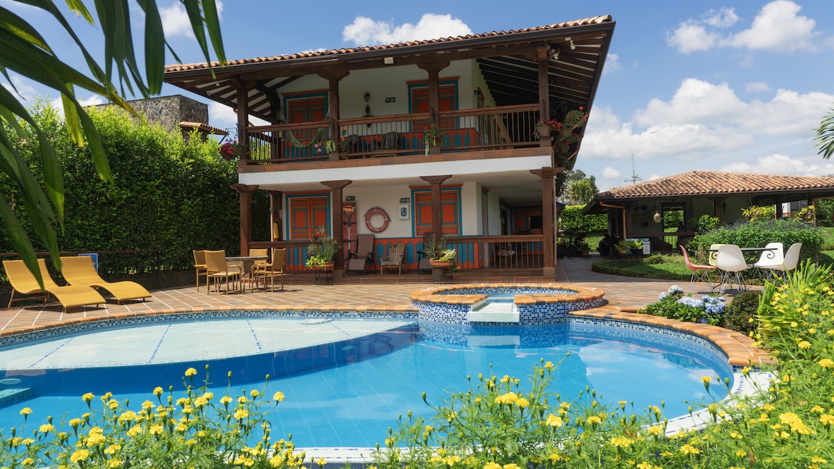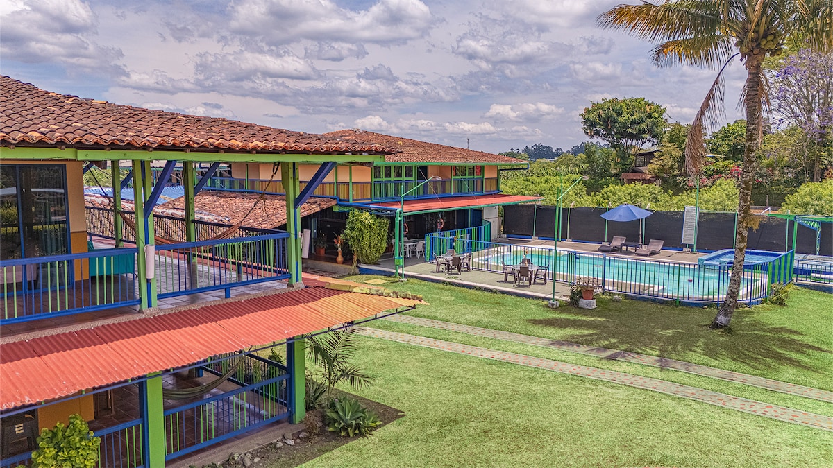 Relax in this traditional Quindío villa, perfect for families seeking comfort and nature. Enjoy a private pool, steam room, green areas, and a social lounge. Kids will love the playground, dollhouse, and trampoline, while adults unwind in a safe and peaceful setting. 📍Prime location: 5 min from the airport, market and restaurants 25 min from Parque del Café 30 min from Armenia. A unique spot to rest, have fun, and explore the Coffee Region.