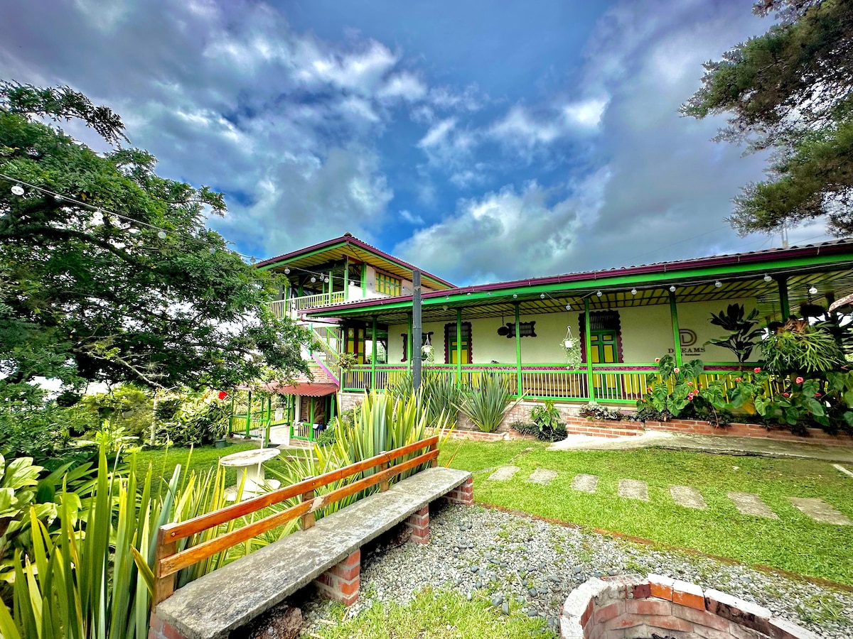 Ubicado entre Circasia y Montenegro, a pocos kilómetros de Armenia, el Parque del Café y otros destinos como Salento, Cocora, Finlandia y fincas cafeteras. Con el encanto arquitectura quindiana, nuestras 8 habitaciones dobles con comodidades como camas King Size, TV LCD, minibar y baños modernos. Disfruta de dos piscinas, jacuzzi climatizado, BBQ y acceso a Internet. Un lugar en donde encontrarás comodidad, naturaleza, hospitalidad y tendrás una experiencia inolvidable.