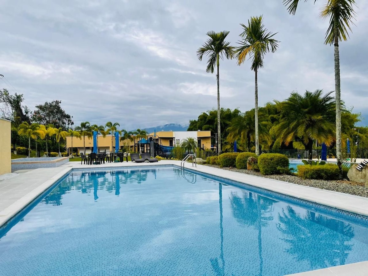 Sensacional y elegante apartasol rodeado de naturaleza; totalmente equipado para una placentera estancia. Podrás disfrutar de un lugar impecable, nuevo con un diseño fresco y acogedor; vigilancia las 24 horas. A 5 minutos del Aeropuerto y 20 minutos del Parque del Café. Comodidades tipo resort: 3 piscinas, tobogán, juegos infantiles, jacuzzi, BBQ, lavadora. Situado estratégicamente para conocer todo el eje cafetero y ciudades como (Pereira 1h30m y Cali 2h30m).