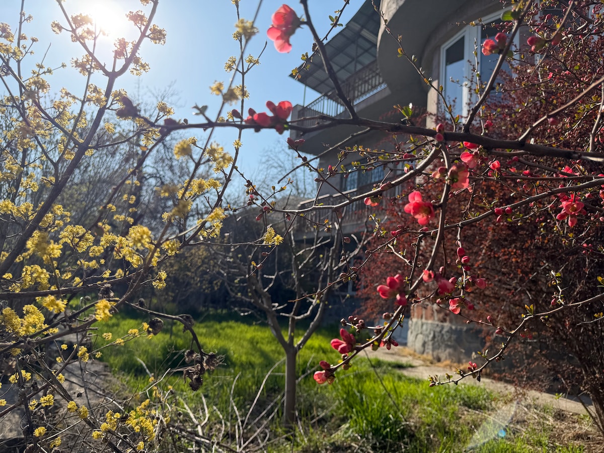 Large 2-floor house overlooking the Garni temple and the mountain panorama, surrounded by an fruit garden (apples, pears, cherries, hazelnuts, etc.). The house is decorated with the works of Armenian artist Martirosyan. Three bedrooms, kitchen-living room, gallery, two bathrooms, 4 balconies. We offer our guests Armenian cuisine (breakfasts, lunches and dinners). We also hold a master class on painting plates on prepared stencils. There is a place for cooking barbeque.