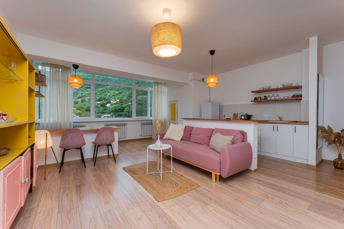 Это небольшая студия позволит в полном объёме насладиться природой, тишиной и течением реки. Забудьте о заботах в этом просторном уединенном жилье. Квартира расположена в ущелье, на берегу реки. Поблизости множество достопримечательностей, например пещеры, древние храмы, леса. Есть активности в виде хайкинга и рафтинга. Точка на карте 41.072869,44.619303