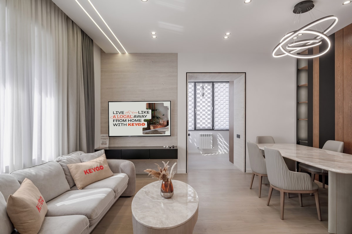 Welcome to a bright and modern 1BDR apartment located on Abovyan Street. The apartment is situated on the 6th floor of a 6-story building with an elevator. Being on the sunny side, the apartment is filled with natural light throughout the day, creating a warm and inviting atmosphere. The living area offers a comfortable sofa, perfect for relaxing after a day in the city. Stable high-speed Wi-Fi makes the apartment ideal for both remote work and streaming, plus a fully equipped kitchen.