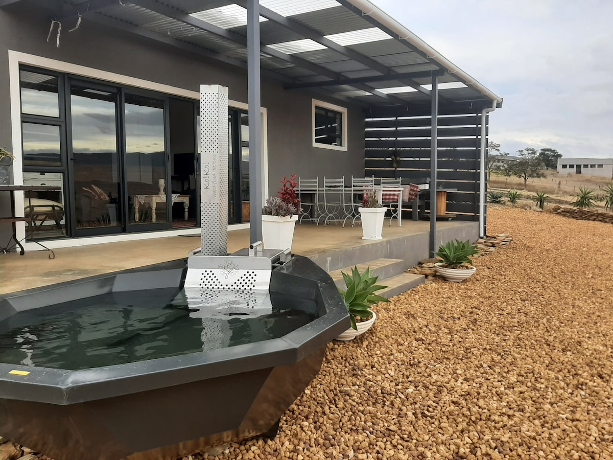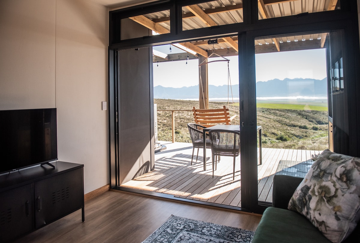Kick back and relax in this calm, stylish space with a 180 degree panoramic view of Struisbaai. This eco conscious space is powered by solar and gas and has rainwater storage tanks …thus no load shedding or water supply issues. It has its own shaded patio, outside dining area and a wood fired hot tub. It is within walking distance from the beachfront, harbour, shops and restaurants. The accommodation consist of a studio area , mini kitchenette, queen size bed and an oversize walk in shower.