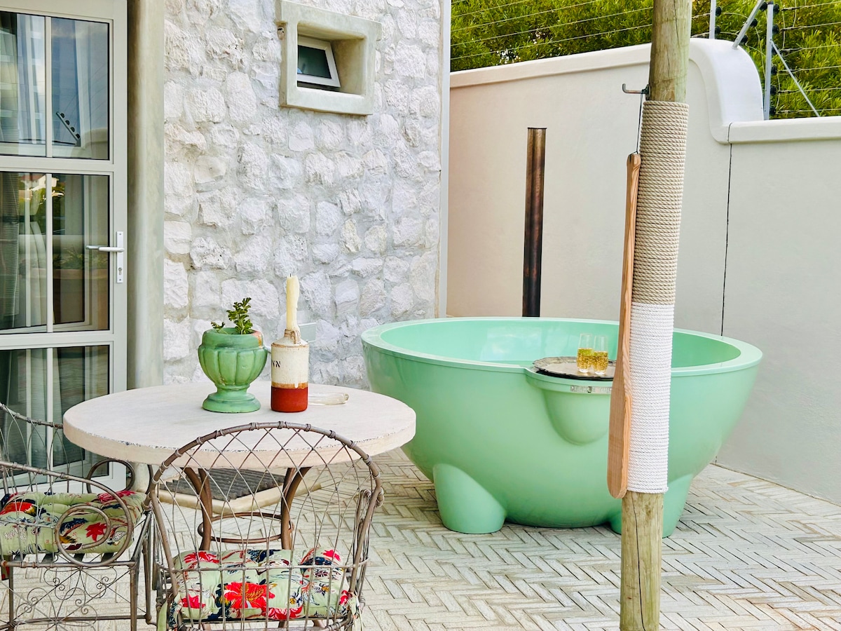 Kick back and relax in this calm, stylish space with a 180 degree panoramic view of Struisbaai. This eco conscious space is powered by solar and gas and has rainwater storage tanks …thus no load shedding or water supply issues. It has its own shaded patio, outside dining area and a wood fired hot tub. It is within walking distance from the beachfront, harbour, shops and restaurants. The accommodation consist of a studio area , mini kitchenette, queen size bed and an oversize walk in shower.