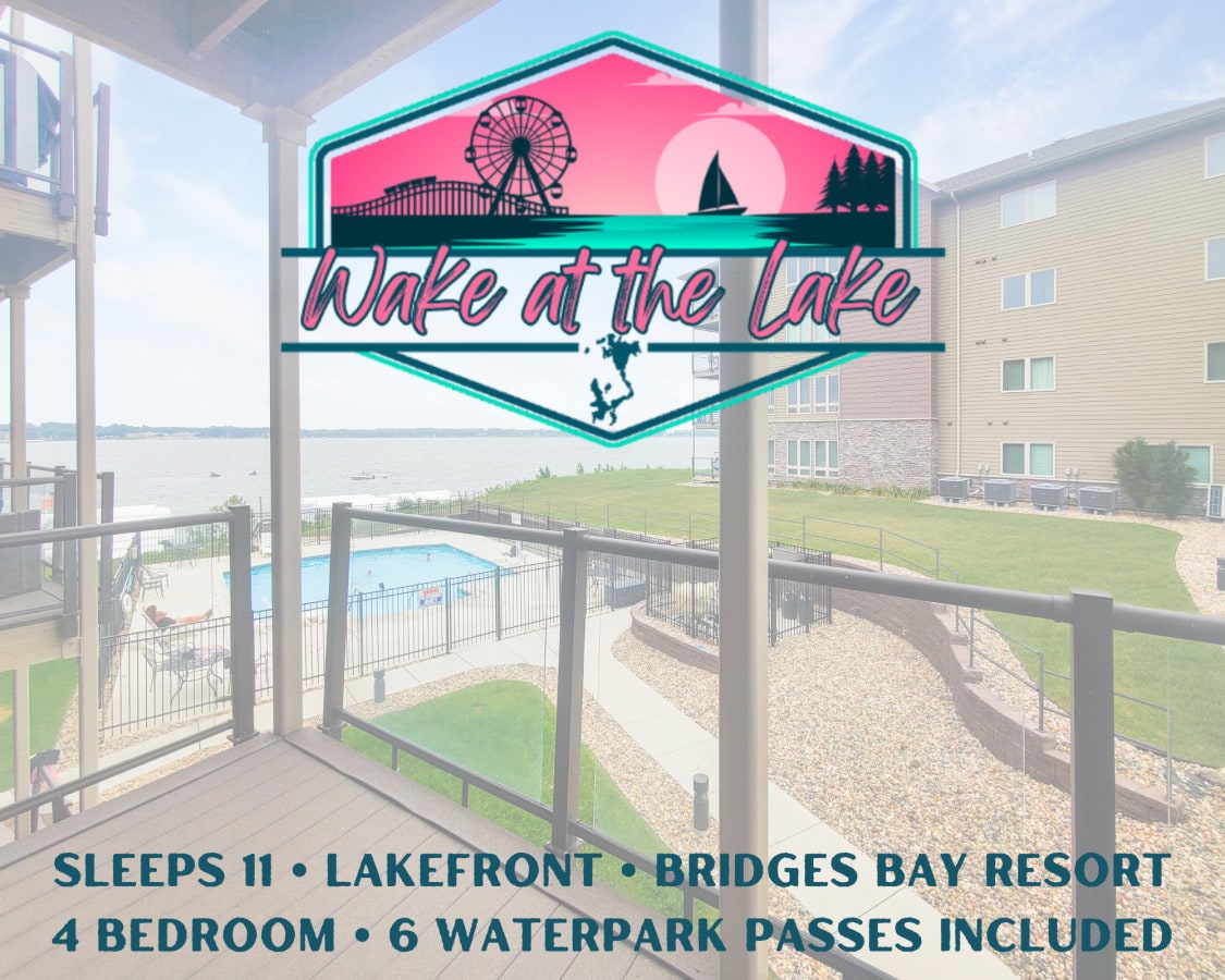 Welcome to Sunset Shores at Bridges Bay Resort! This spacious 4 BR, 3 Bath condo with stunning East Lake views sleeps 11 and includes 6 daily waterpark passes. The condo is fully equipped with kitchen essentials, a breakfast bar, and a large dining table, perfect for gatherings. Step out onto a private deck with ample seating or enjoy the cozy living room with a fireplace and large windows.Minutes away from Arnolds Park, dining, and shopping, plus resort amenities like pools, gym, and an arcade.