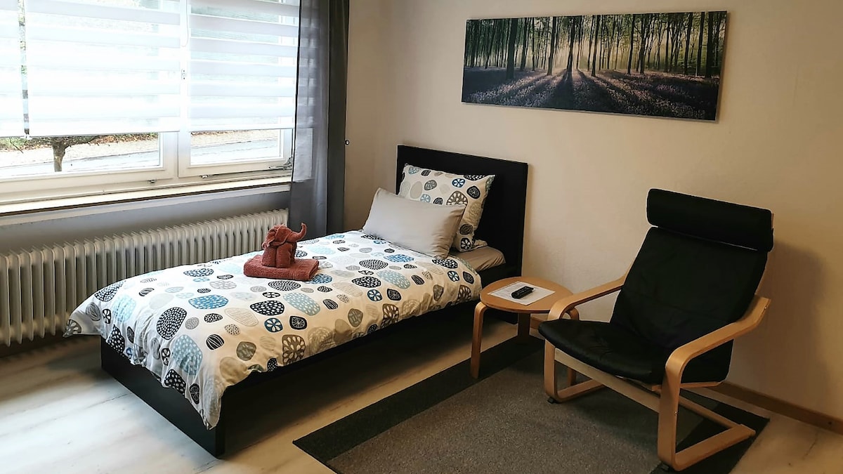 Hier wohnst Du auf 25 m² in einem hellen, nett eingerichteten Studio. Obwohl direkt an den Naturpark Arnsberger Wald angrenzend, sind es nur 1,5 km bis zur Innenstadt von Neheim mit ihren vielfältigen Einkaufsmöglichkeiten. Neheim ist der grösste Ortsteil innerhalb der Stadt Arnsberg. Ein Discounter (Netto) incl. Backshop mit Öffnungszeiten von 07 - 21 Uhr befindet sich in 800 m Entfernung. Die Gastgeberfamilie wohnt im gleichen Haus eine Etage drüber.