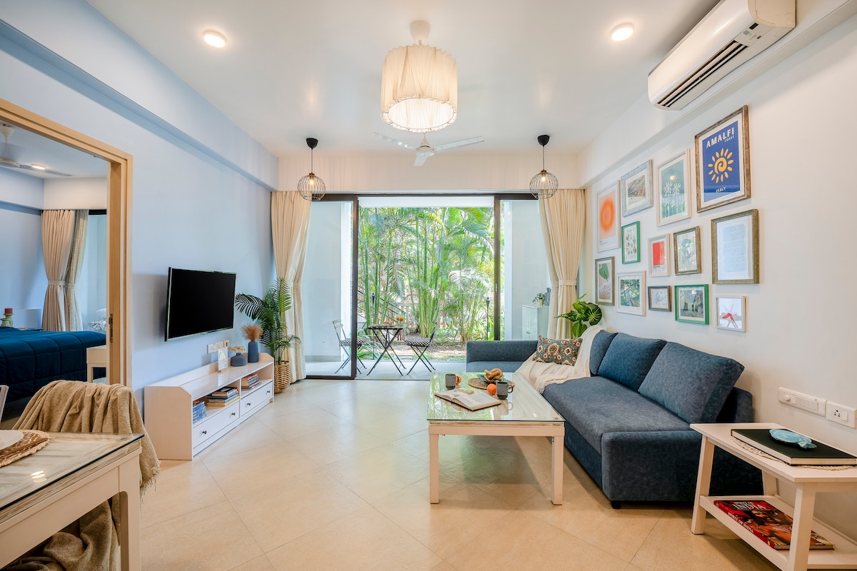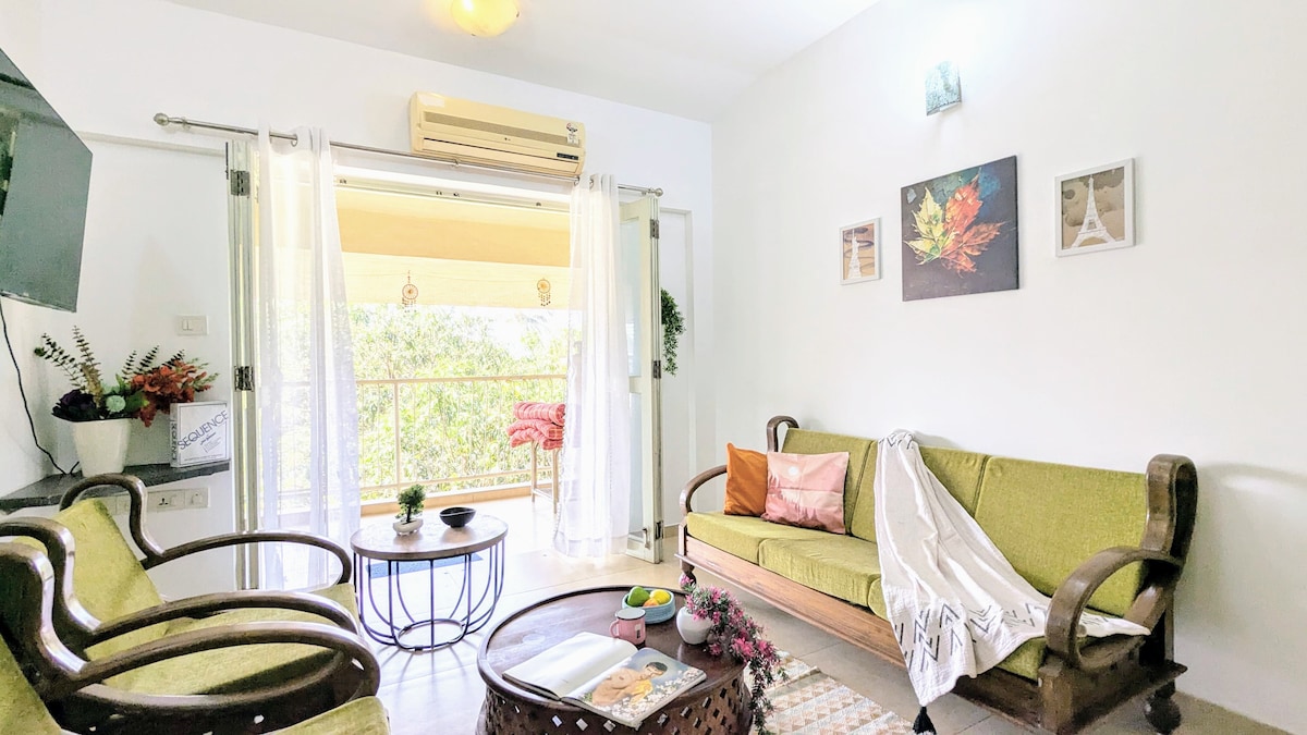 Welcome to my cosy holiday home. Nestled amidst countless coconut trees, the Goa vibes are on point here. This 1bhk is perfect for up to 3 people & has everything you need. Wi-Fi, a well stocked kitchen, spacious balcony and living room, a smart tv, good views, & of course, good vibes! You can take a relaxing dip in the pool, workout in the gym, or hop over to sweet lil Uddo beach for sunset and kayaking. Central yet peaceful location in a beautiful gated society.