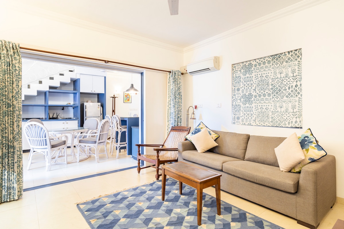 Escape to Blue Turtle by Coast and Cloud. Sunset walks, party nights or lazy beach days this is your home away from home in Goa's vibrant heart! 🐢🌊 Cozy nest, modern comforts: - 10 mins from Baga (3.4 kms) & Calangute (4.3 kms) beaches - Double bed with warm lights & fairy tale vibes - Sofa bed for extra guests - Fully equipped kitchen with microwave, fridge - Invertor, AC, Wi-Fi & workspace Perfect for solo travellers, couples, or small families – make memories in our comfortable haven. 🏖️