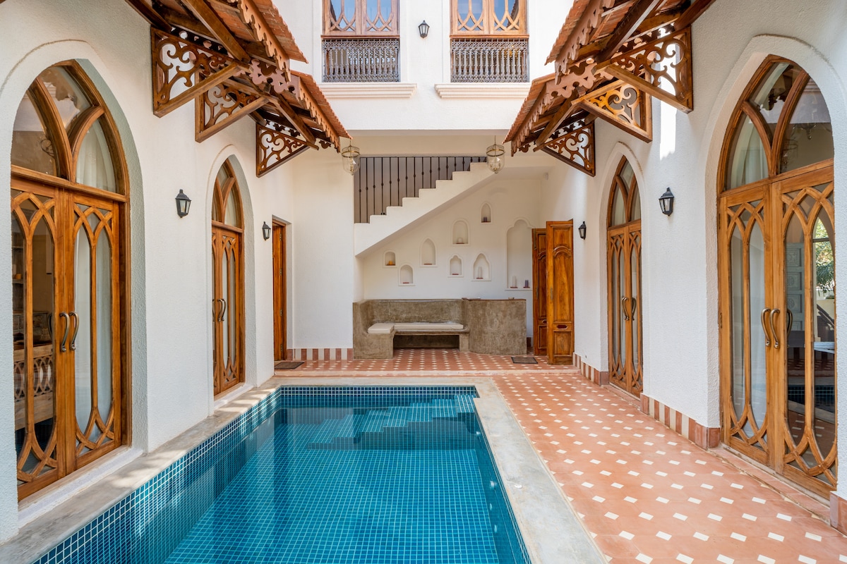◆ Elegant 4BHK villa with a vintage touch in North Goa ◆ Antique living area with rustic ceiling & regal accents ◆ Private pool with tiled deck, bar counter & cozy seating ◆ Entertainment lounge & refined bedrooms for leisure & rest ◆ Vagator Beach: 4.6 km | Chapora Fort: 4.3 km ◆ Market: 6 km | Airport: 24.9 km | Medical: 6.8 km ◆ 5-star hospitality inspired by “Atithi Devo Bhava” warmth