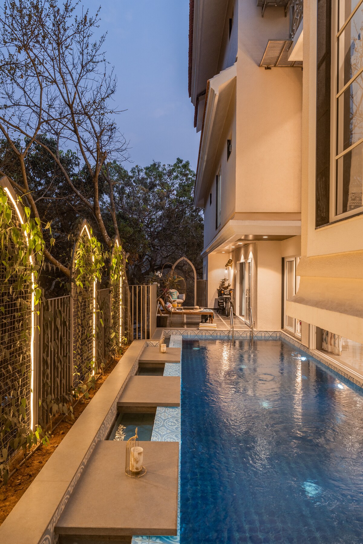Step into a world where luxury knows no bounds, at Villa Shiv&Aai by Staymaster, our spectacular 4-bedroom Mediterranean villa in the heart of Goa. This villa is a flamboyant masterpiece, boasting an extravagant and quirky Indian interior design style that is unabashedly maximalist. It houses a pristine swimming pool and patio, poolside cabana, sauna, garden, basketball court, and sumptuously-decorated interiors comprising four ensuite bedrooms & open-plan common areas, including 3 living areas!