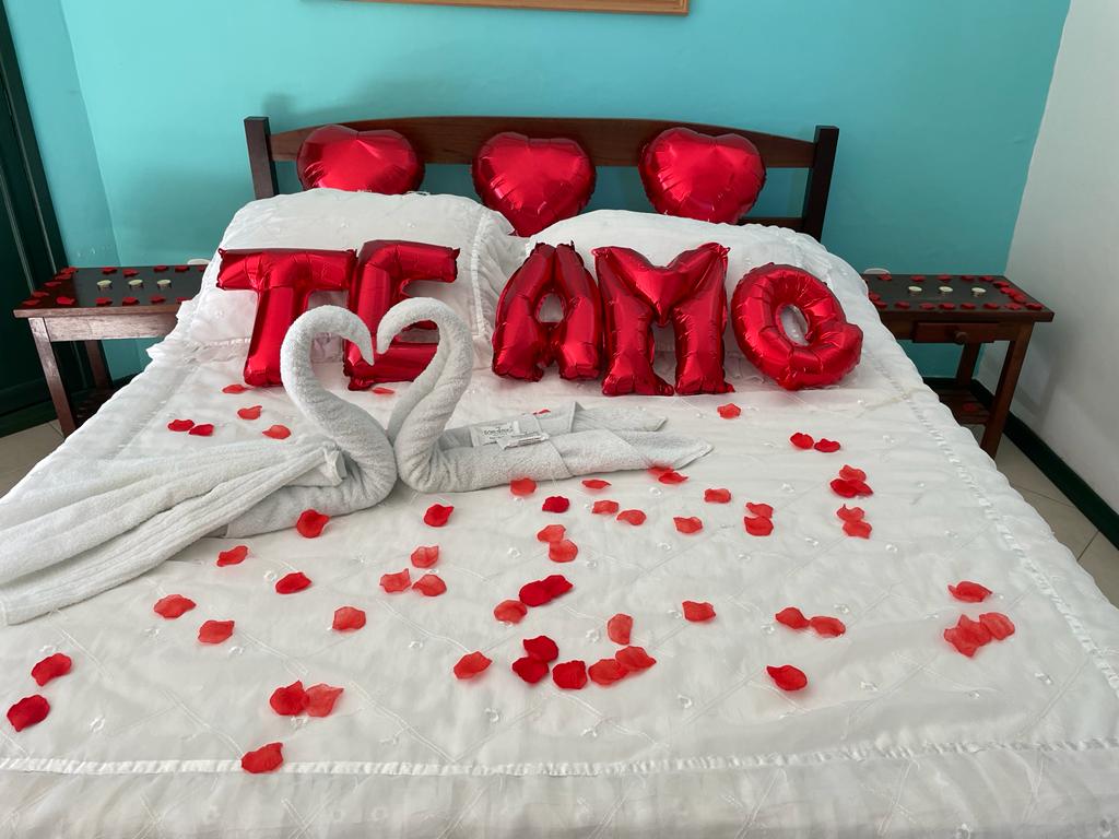 Suite turquesa com vista para o mar . surpreenda o seu amor Decoração romântica Tauba de frios bande de bebidas Passeio de barco consulte nossos valores SUITE 01 01 cama de casal 01 frigobar 01 tv 01 ar condicionado Ambiente Familiar @ casabellavistaarraial VISTA PARA O MAR.