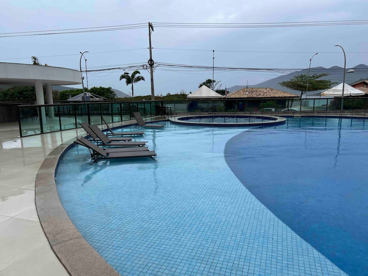 Melhor e mais estruturado condômino da região tipo resort linda vista da lagoa por do sol ,indescritível, piscina, sauna, academia, salão de jogos, Parque Infantil, Restaurante, estacionamento. 10/15 min de carro do centro de Arraial do Cabo, menos de 5 min de carro de supermercado, farmácia,restaurantes, padaria, pizzaria etc 3min de carro praia maravilhosa verdadeiro paraíso Pertinho de Cabo Frio, 4min de carro do aeroporto Perfeito p férias dos sonhos com muito sossego