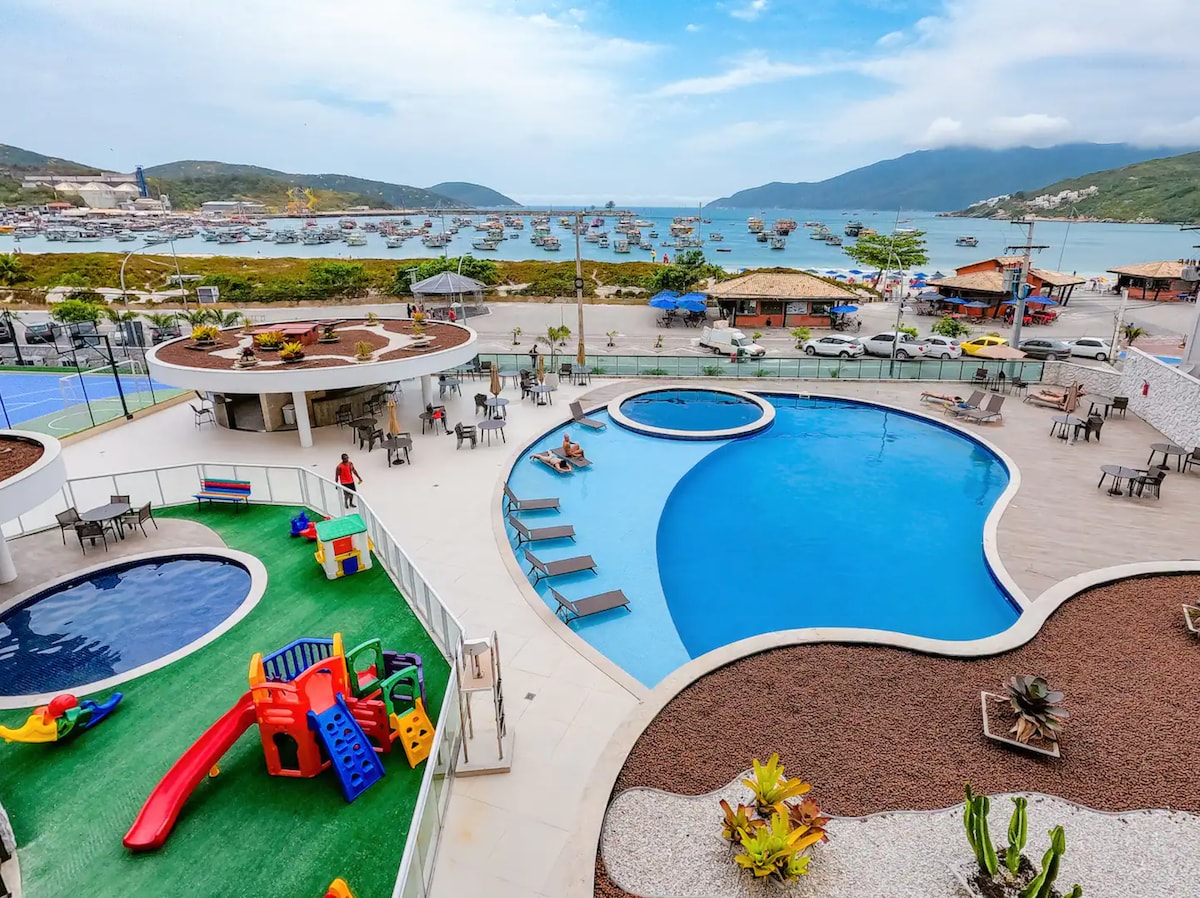 Condomínio na praia dos Anjos, em Arraial do Cabo com grande infraestrutura à beira-mar. Possui quadra poliesportiva, piscina com SPA (hidromassagem), academia ao ar livre, academia interna, sauna seca e a vapor integrada a piscina, cinema, salão de jogos, brinquedoteca, salão de festas. Apartamento para até 8 pessoas.