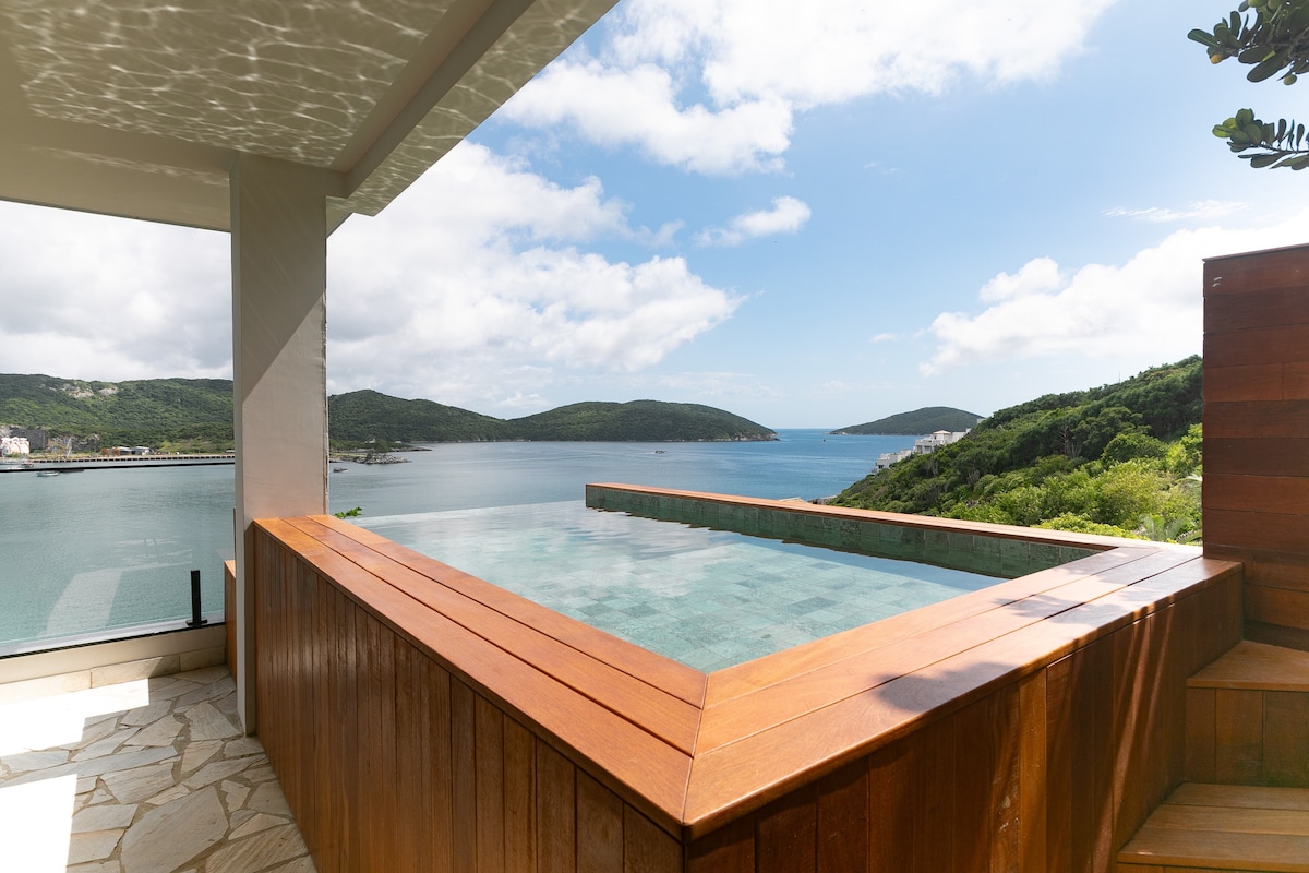 Experience unbelievable panoramic ocean views from this 4 bedroom flat paradise in Buzios. Located inside an ecological reserve, you will enjoy relaxing vacation in a beautifully decorated property with everything you need surrounded by nature and the sounds of the ocean. Only 18 minutes from downtown Buzios and 12 minutes from Portal da Barra.