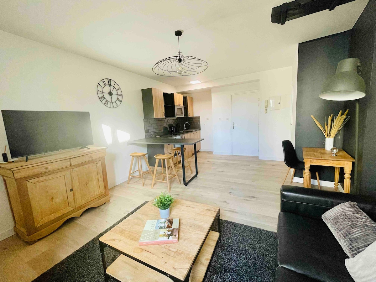 Appartement en duplex cocooning sublimé par une décoration moderne récemment rénové. Idéal pour les couples ou voyageurs d'affaires. Emplacement exceptionnel : 100 mètres des places, 10 minutes à pied de la gare TGV dans un immeuble en pierres blanches. Vous pouvez profiter des animations de la ville à pied, flâner sur les places, prendre un verre en terrasse au pied du magnifique beffroi.