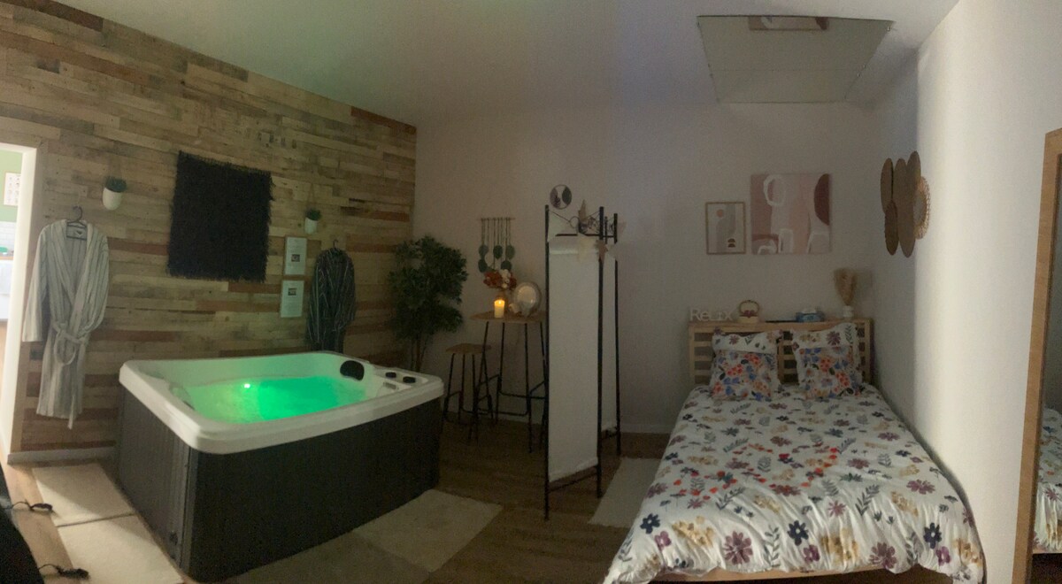 Plongez dans une bulle d’intimité avec notre suite bohème chic et son jacuzzi privatif en accès illimité. Ambiance tamisée, pétales de roses, boissons chaudes… tout est pensé pour une soirée romantique inoubliable. Lit douillet, douche à l’italienne XXL, serviettes moelleuses, peignoirs, parking privé et arrivée autonome : il ne vous reste qu’à profiter, à deux. ✨ Idéal pour un anniversaire, une demande en mariage ou un week-end romantique. Offrez-vous une pause bien-être loin du monde.