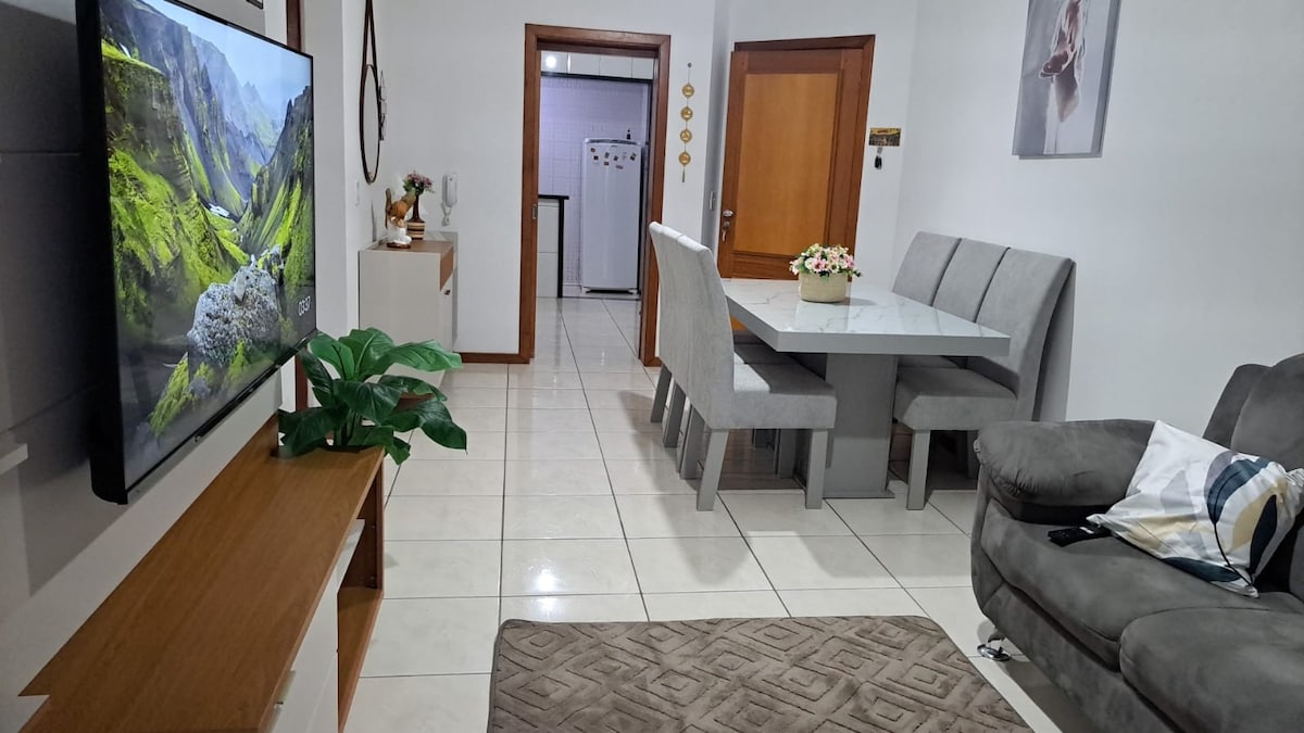Apto simples, bem arejado e de bons espaços, na avenida principal da cidade, mercado, lojas e demais comércios próximos, cozinha aberta junto ao jantar e a sala com acesso a sacada de frente, tv com streaming liberados, sofá grande, banho social, lavanderia grande para os utensílios de praia, maquina de lavar, suite com sacada de frente com ventilador de teto, segundo dormitório com split. Tem 2 camas de casal. Garagem coberta no patio dos fundos, com bastante espaço para as crianças correrem.