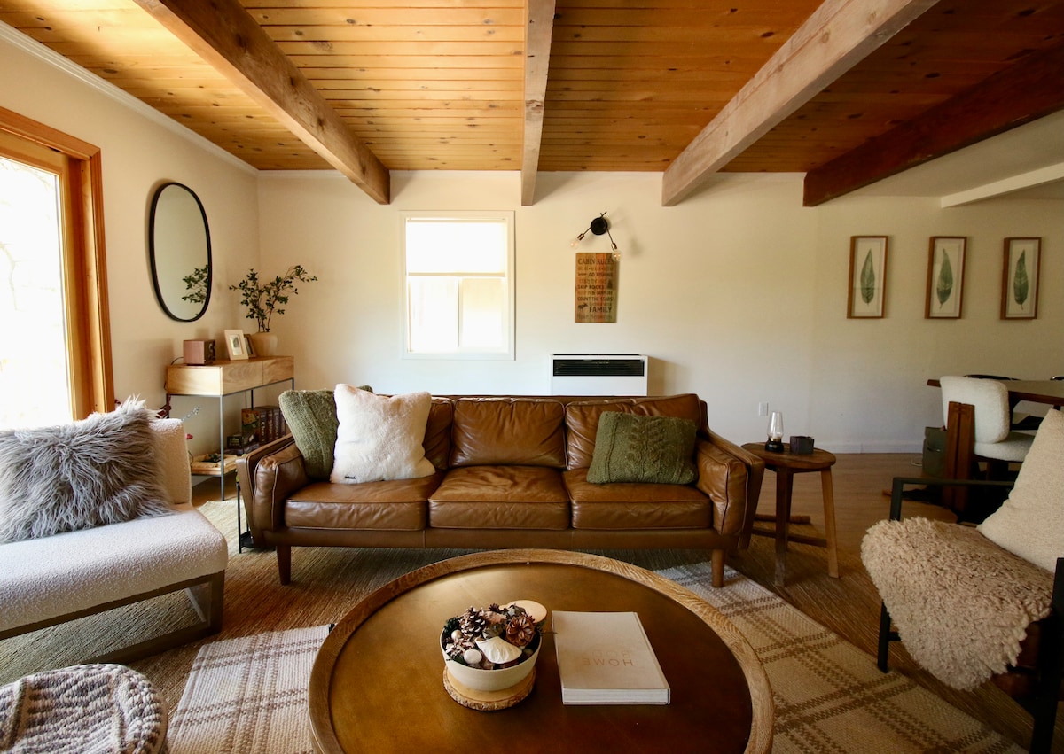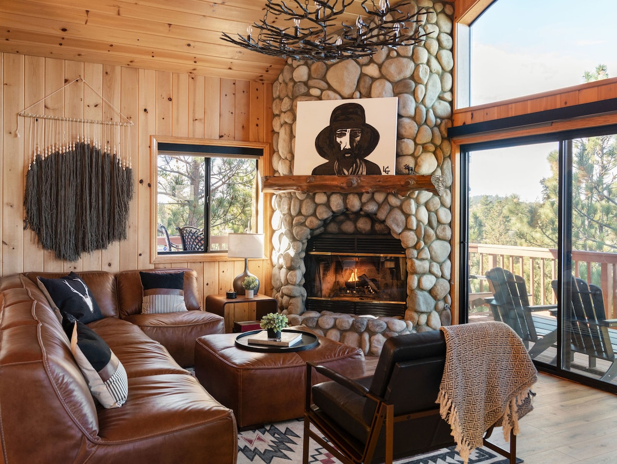 Welcome to The Den, a 1960s cabin reimagined by LBL Design Co. This moody, romantic retreat blends almond-blasted ceilings, warm wood tones, and modern finishes — complete with a private hot tub under the pines. Perfectly centered in the San Bernardino Mountains, it’s your base for snow days, trail adventures, and slow, cozy nights by the fire. Sip wine on the deck, roast s’mores under the stars, and unwind beside the glowing fireplace on our plush velvet sofa.