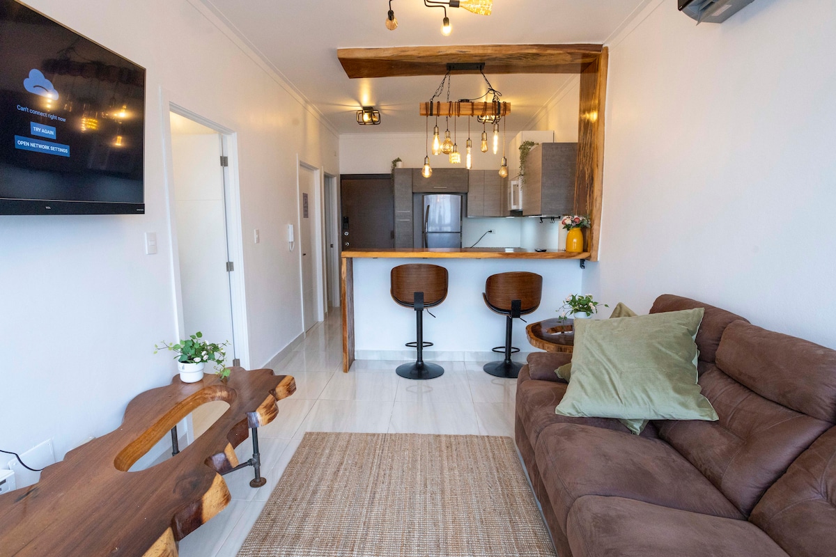 Es una acogedora estadía en la ciudad con una decoración industrial con todo lo que puedes necesitar apra tu estadía. Su ubicación hace que sea más fácil encontrar transporte y moverse. La Embajada de US, INTEC, UNPHU, Hospitales, Supermercados (Bravo y Pricesmart), Jardín Botánico, son algunos de los lugares cercanos. Es un apto económico con todos los servicios que necesitas. Recibirás la mejor relación calidad-precio. *Está en una avenida concurrida*