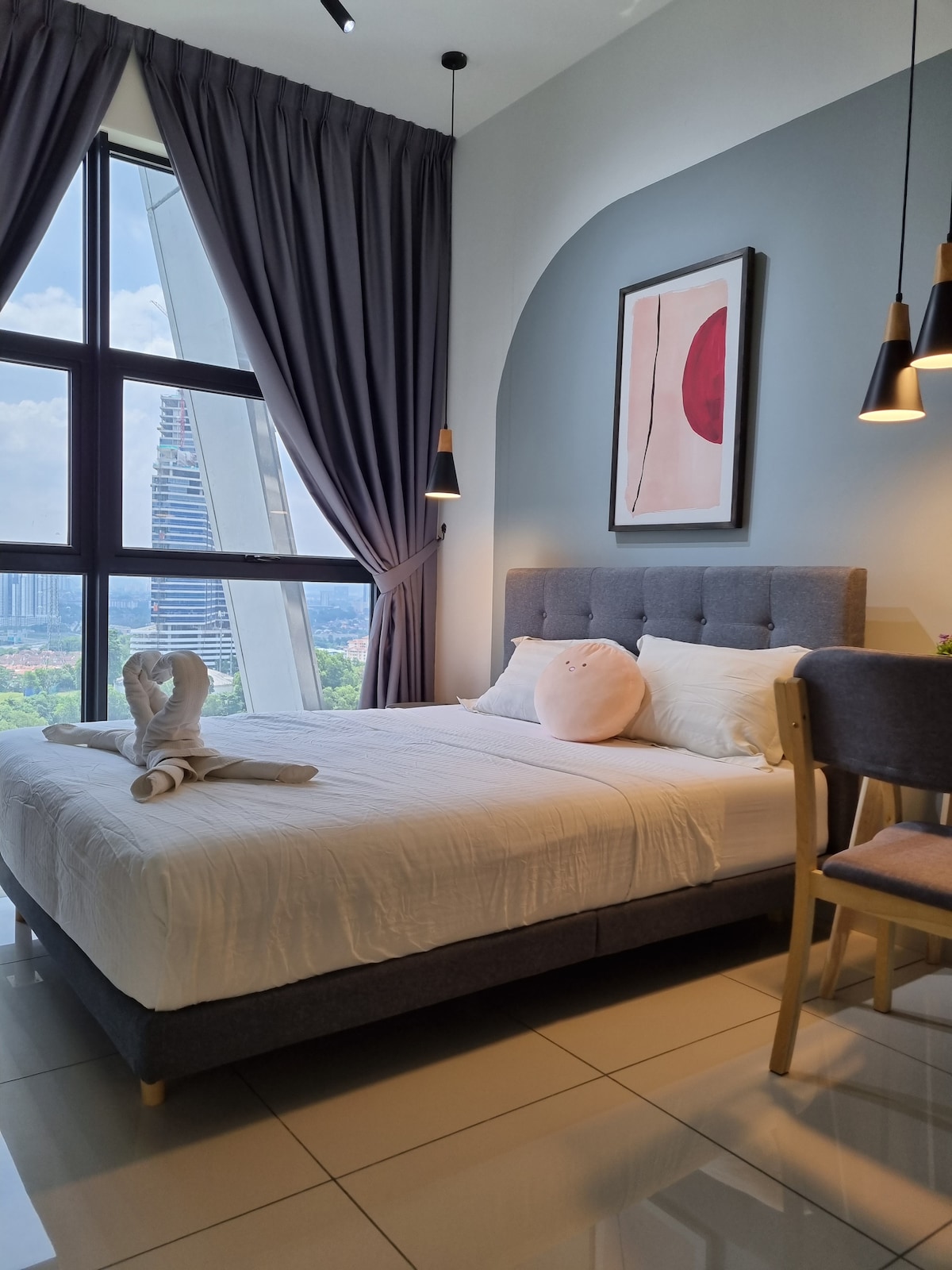 Welcome to our Robertson Residence, a serene sanctuary nestled in the heart of the city over looking the Twin and KL tower landscape. This luxurious apartment promises an unforgettable stay with modern comforts and chic decor. The apartment includes a well-appointed kitchen for those nights you feel like playing chef. The bedroom, dressed in crisp linens, guarantees a peaceful night's sleep.