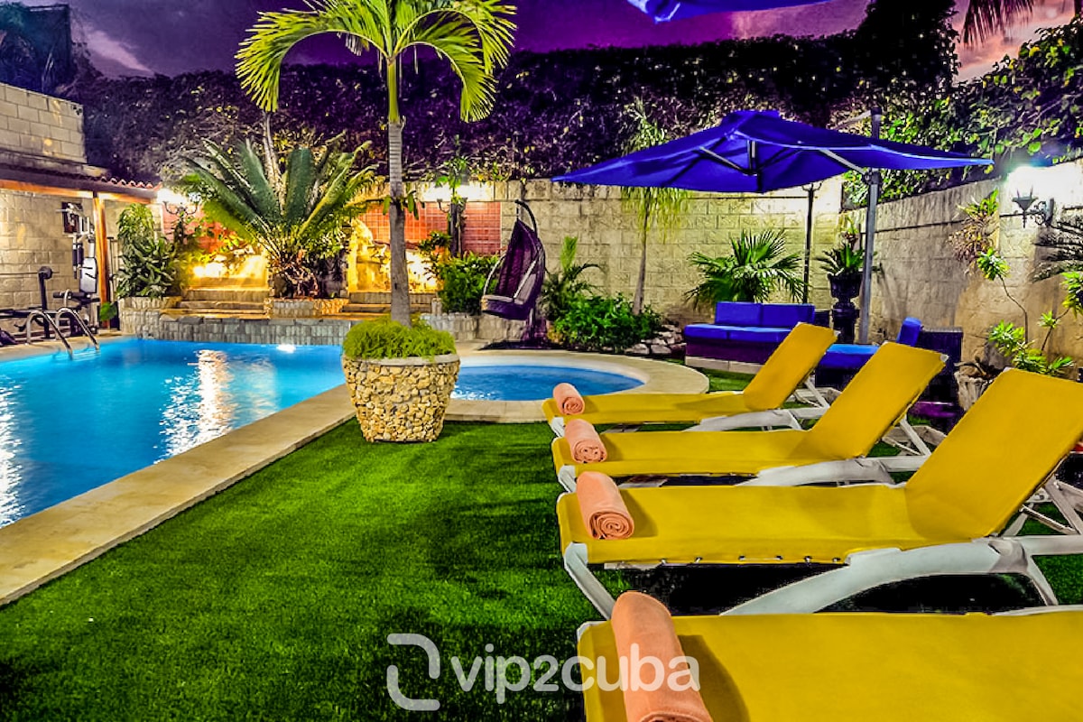 Quiet, gorgeous place amid tropical vegetation, in the best residential neighborhood of Siboney, three confortable rooms with air conditioning, private bathrooms and cable tv international, WIFI, minibar, huge patio with tiki house, banana trees, avogados, mango, guava, mamey, soursop, lime, a huge open sky terrace with bar for parties. Tranquillity, relaxing and green space with all comforts, kitchen, patio, terrace and bar. Daily quiet and green neighborhood, with hummingbirds and parrots