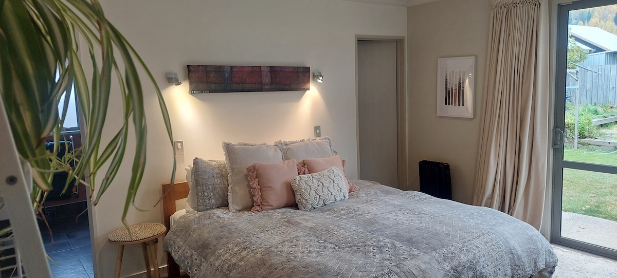A self contained studio with queen sized bed, living area, kitchen & ensuite. A new build, this is a warm and cosy space in a private garden setting with spectacular mountain views and easy access to walks and trails in the Lower Shotover area. We are located 5 minutes from bus stop and a leisurely 10 min stroll to shops (supermarket, restaurants, cafes, etc). Hosts live on site and are happy to share their local knowledge.