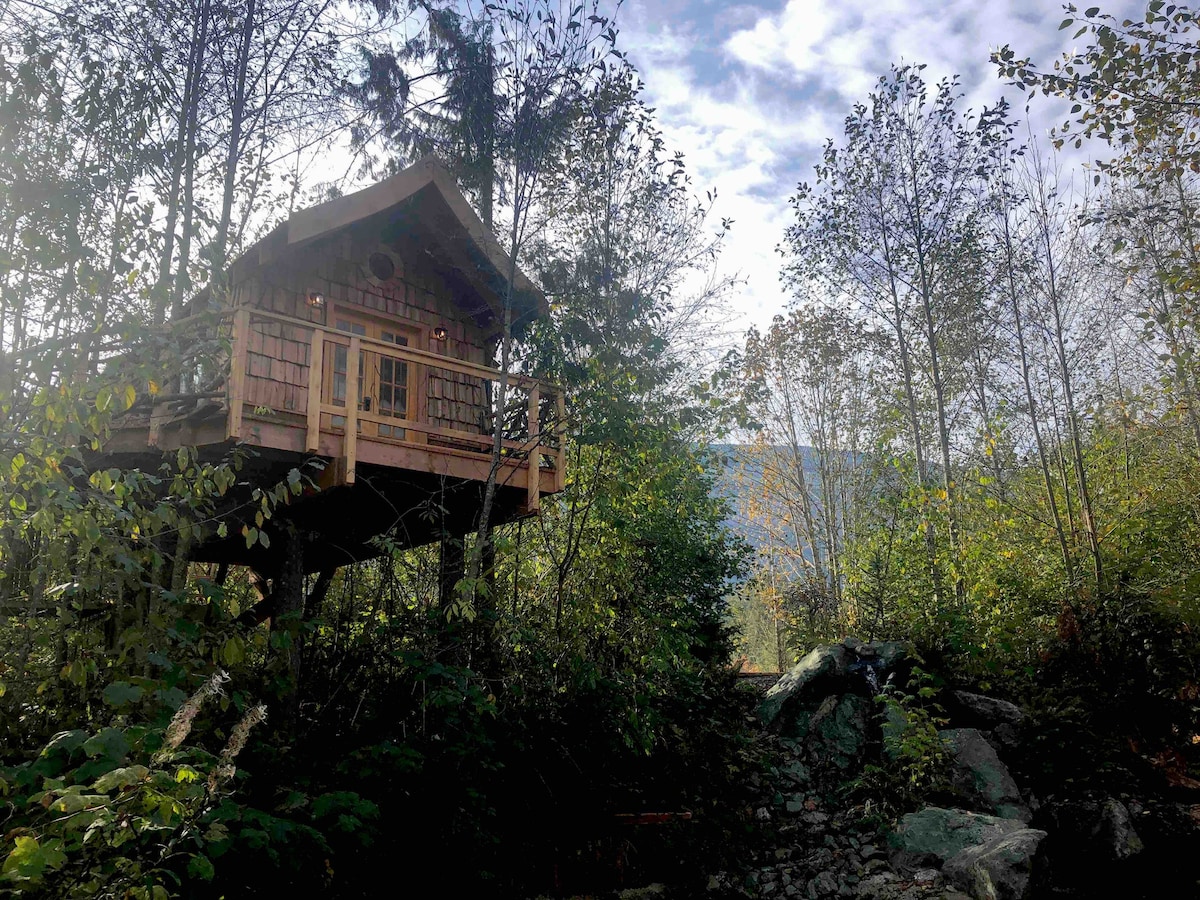 Beautiful Treehouse getaway for your family or a romantic getaway for two. Perched 17 feet above the pond's edge nestled in the trees. Enjoy a quiet warm campfire or relax on the dock and listen to the pond's waterfall. The Pond's Perch is the perfect spot to disconnect and rest after exploring the north cascades. The treehouse features a comfortable full-sized bed and a cozy murphy bed in the front room. Enjoy the fireplace, microwave, keurig, refrigerator, and indoor bathroom.
