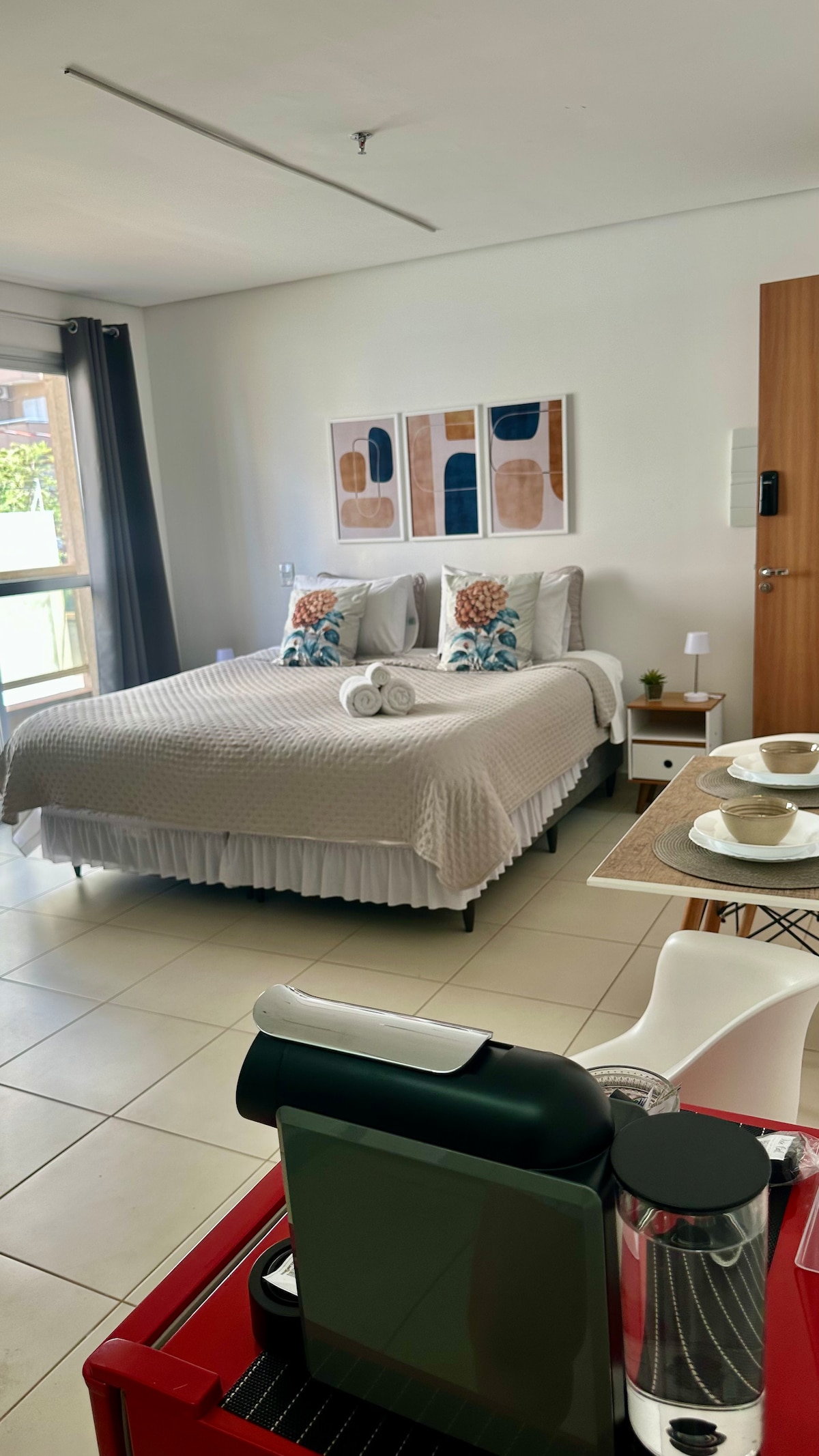 Studio with air conditioning, wi-fi, 50' smart TV, queen bed and parking space in the building's parking lot. Building with excellent structure (swimming pool, Blue Fit gym, 24-hour market, home-office space, etc.), with concierge and 24-hour security team. Privileged location in the South Zone, on one of its main avenues (1.5km from Ribeirão Shopping; 2.5km from Botafogo Stadium; and close to several renowned bars/restaurants in the city). *Included: bed and bath linen.