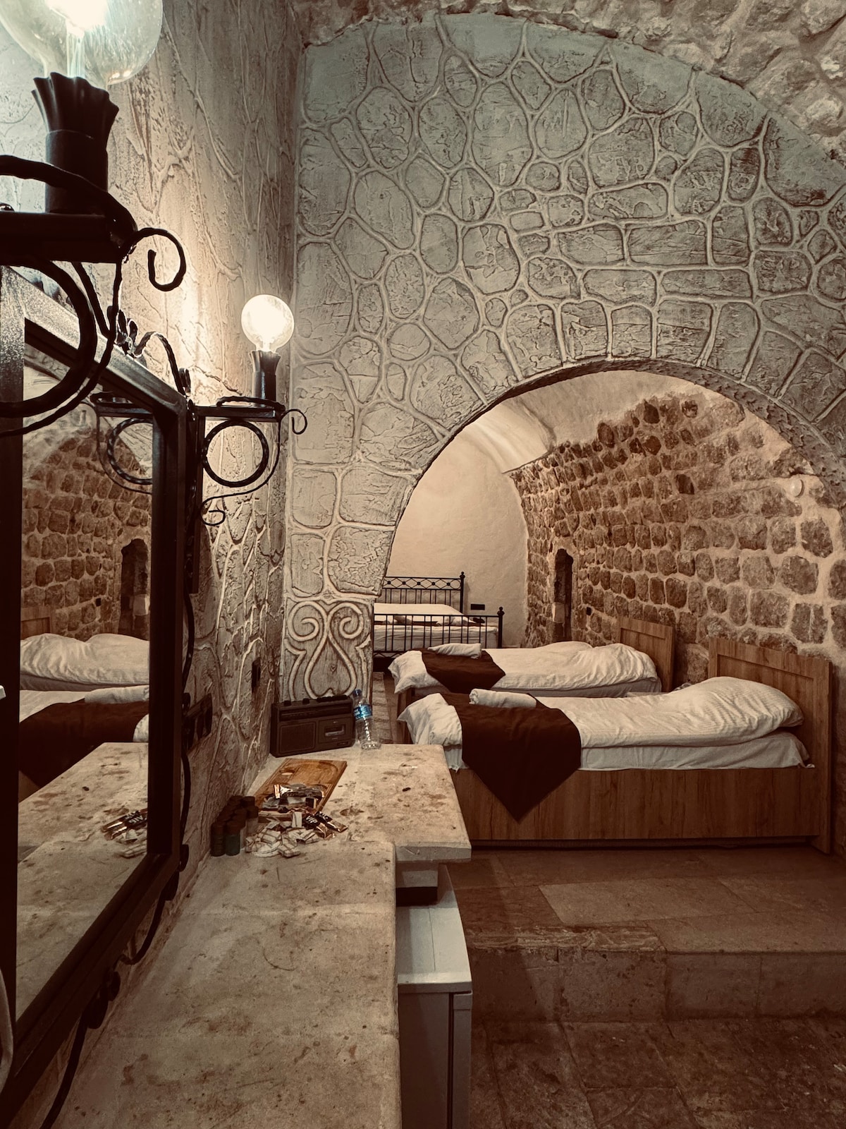 Mardin’in tarihi taş evlerinden birinde, orta kat dairemizde sizleri ağırlamaktan mutluluk duyarız. Dairede 2 oda bulunmaktadır ve her odanın kendine ait özel banyosu vardır. Misafirlerimiz ayrıca en üst kattaki salon, mutfak ve avluyu da kullanabilirler. Tarihi taş duvarlar arasında, sıcak ve samimi bir ortamda konforlu bir konaklama deneyimi yaşayabilir, Mardin’in eşsiz manzarasının ve kültürünün tadını çıkarabilirsiniz.