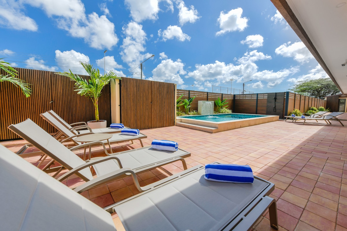 this one-bedroom apartment offers it all for relaxation and leisure. Unwind in your private plunge pool, perfect for refreshing dips or lounging in the sun. there is also a BBQ grill to top off the island life experience. centrally located in a nice neigboorhood. 10min ride to nearest Beach and the airport. 10min ride to downtown, as well as the big supermarkets. smaller grocery stores can be found at a few minutes away. 5 of Aruba's best food trucks can be found within a 5 minute radius.