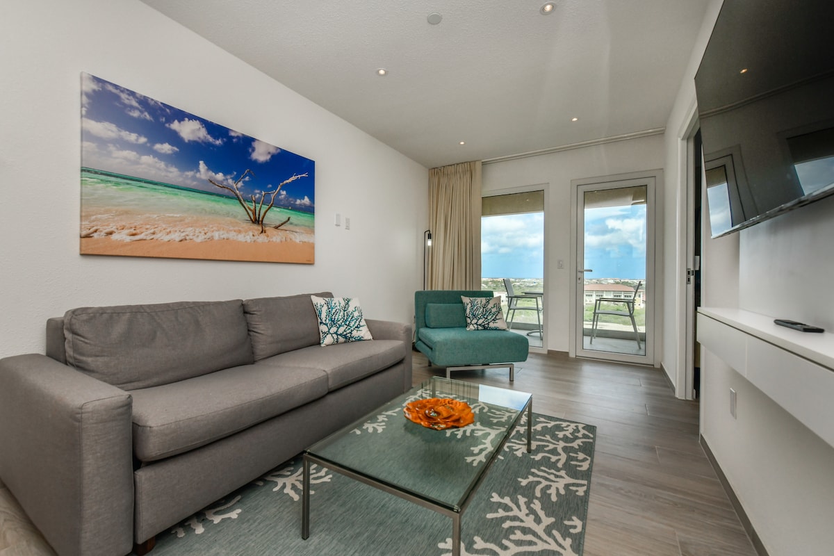 This beautiful studio reflects Aruba's blue colours with a very Modern and CLEAN design, offering a very comfortable KING size bed & King size pillows, a fully functional kitchen, beautiful walk-in closet, modern bathroom with a spa like Rainfall shower. Located on the highest floor of the building with a stunning view of downtown Aruba as well as the harbour! Enjoy the infinity pool and rooftop hot tubs with 360 view and state of the art gym overlooking the water and cruise ships!