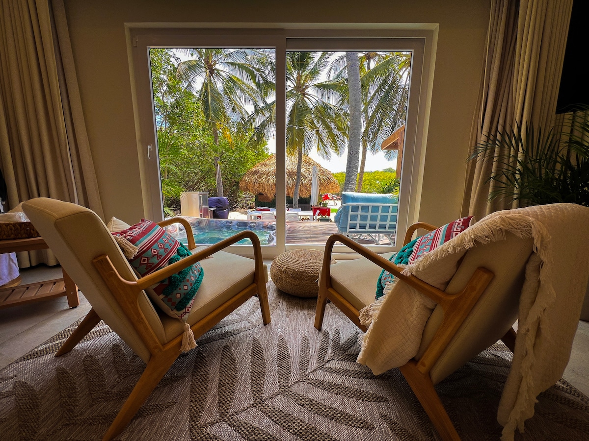 Cadushi Villa (cactus) was build with the resilience of the cactus in mind. A 100% completely private villa located in the middle of nature, with a spacious deck surrounding a 5 person hot tub with a gorgeous view of a cactus fence in the background, locally known as a “Trankera”. Sip your cup of coffee in the morning or enjoy of a relaxing afternoon with a beautiful sunset laying in a hammock on the deck while grilling on the BBQ grill. Lounge in the cozy little garden and get a nice tan.