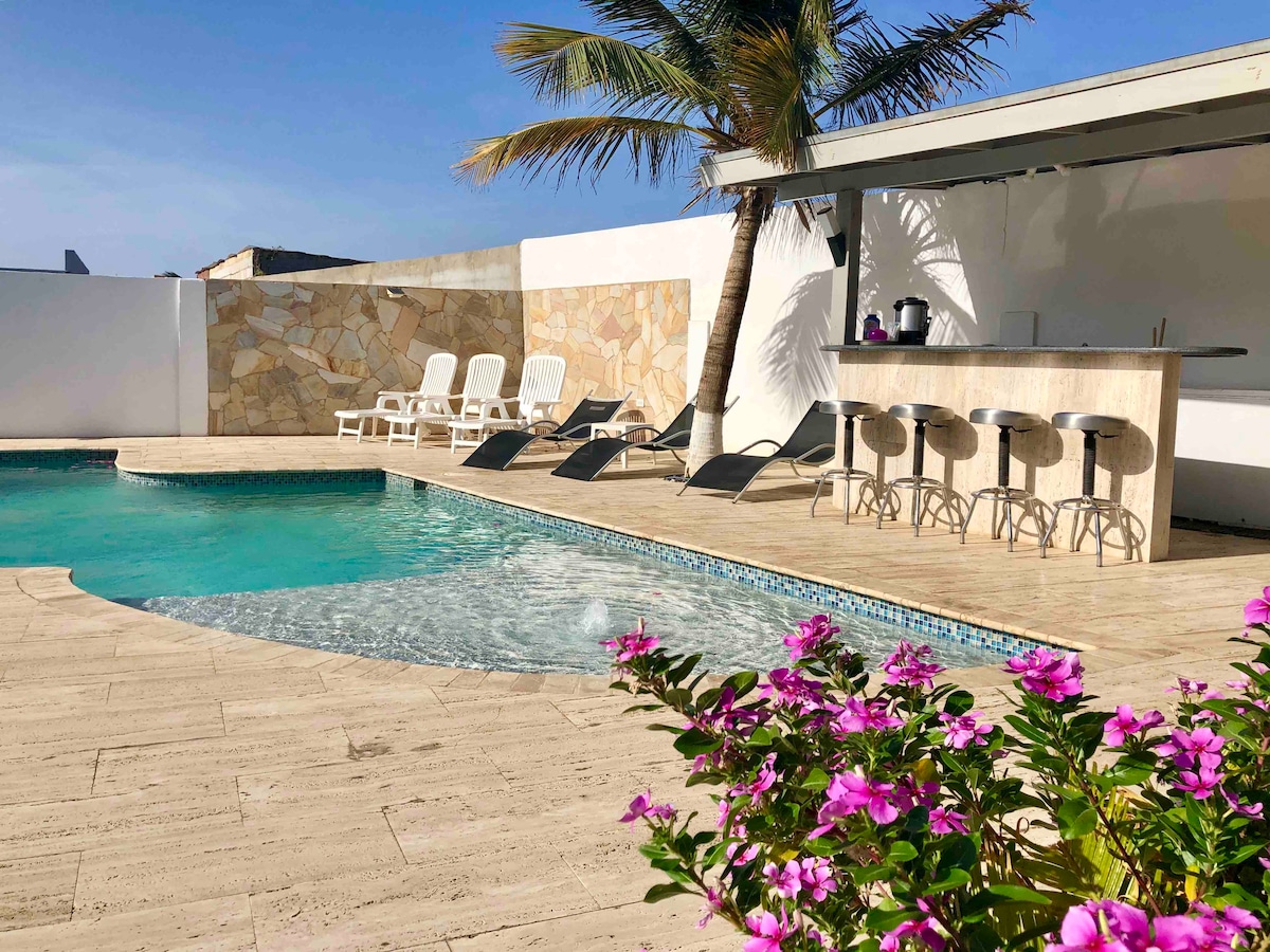 Cute townhouse perfect for a relaxing time, overlooking Hooiberg. Enjoy a beautiful tropical garden with a backyard and pool, ideal for a nice breakfast or coffee. Listen to birdsongs and feel the tropical breeze in the front garden, backyard, or by the pool. Conveniently located a 5-minute car ride from the airport, with the bus stop just a 10 to 15-minute walk away. Surfside Beach and local bars are within a 20 to 30-minute walk, and Oranjestad is a 15-minute drive