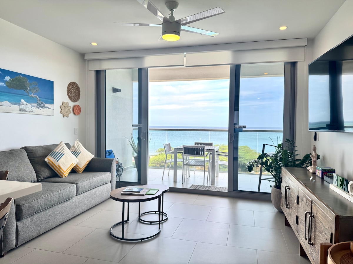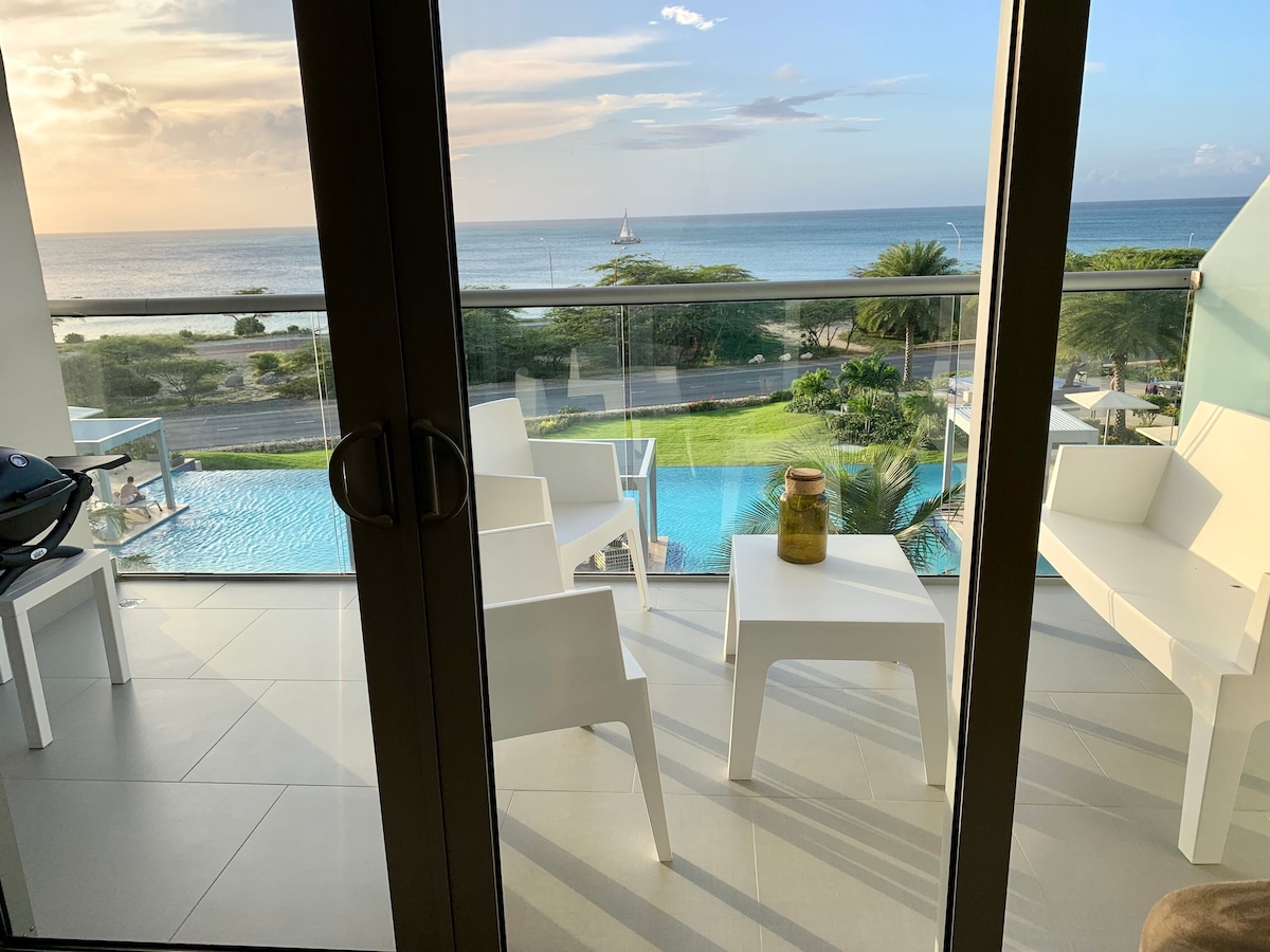 Exquisite ocean front view one bedroom, 2 full bathrooms condo, 1400 sf living and terrace area, fully equipped, free wifi, tel, a/c, safe box, pool, jacuzzi, gym, 24 hour security, private parking, calm and relaxing atmosphere. Only steps away from the best beach on the island and top five in the world the amazing "Eagle Beach", close to restaurants and supermarkets, nice and quiet neighborhood. Beach chairs, towels even a cooler provided.