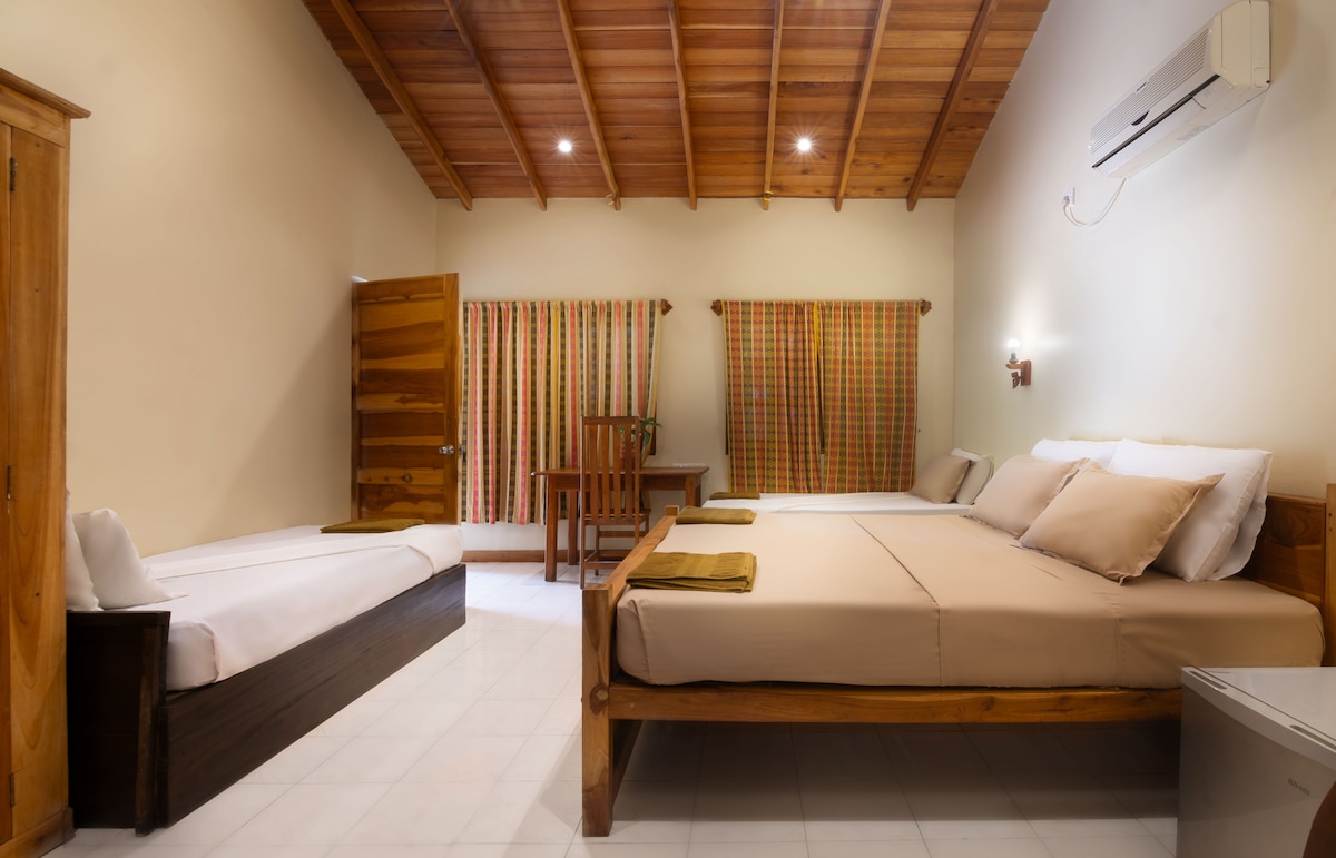 Our double room at Eagle Resort is a beautiful space set around a tropical garden in the vibrant village of Arugam Bay. The spacious room comes with fan or air conditioning, desk, space to hang clothes, and a private bathroom. Wake up to the sounds of the Sri Lankan birds rising. Enjoy coffee outside your cabana, eat in the cool communal area, and treat yourself to a wealth of delicious restaurants on your doorstep.
