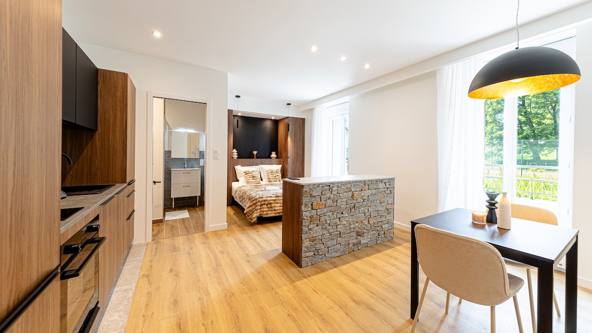 Joli Studio rénové avec goût, situé dans un ancien palace d'Aix les Bains à 2 pas du centre-ville (Casino, Office de Tourisme, Commerces, Parc de verdure). Parfait pour votre séjour en cure, un séjour professionnel, votre stage ou vos vacances en Savoie. Résidence calme sécurisée par digicode. Pour un séjour supérieur à 7 nuits : je vous demanderai un chèque de caution de 300€ que je vous rendrai à la fin de votre séjour. Linge de lit fourni. English / Italiano.