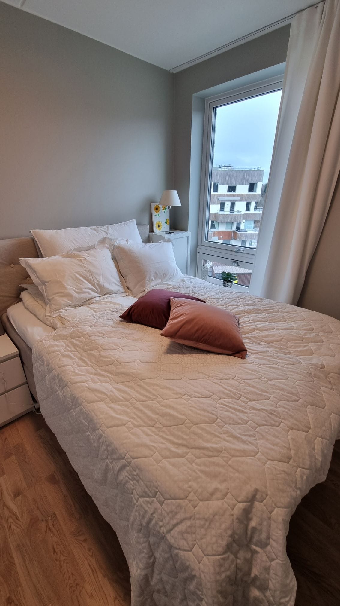 Leilighet med høy standard, romslig terrasse med sofa og spiseplass, takvifte på soverom, «waterfall» - dusj, vaskemaskin og tørketrommel. Fire minutter til bussholdeplass. Sengen er 140 cm, så skal man være 2 bør man være et par eller veldig så gode venner :) Mulig å leie parkering. Anbefaler å laste ned Aimo Park appen på forhånd, da den kan være vanskelig å laste ned via 5G nettet. Leiligheten ligger ikke «nær innsjø», men har foreløpig ikke greid å fjerne det fra AirBnB.
