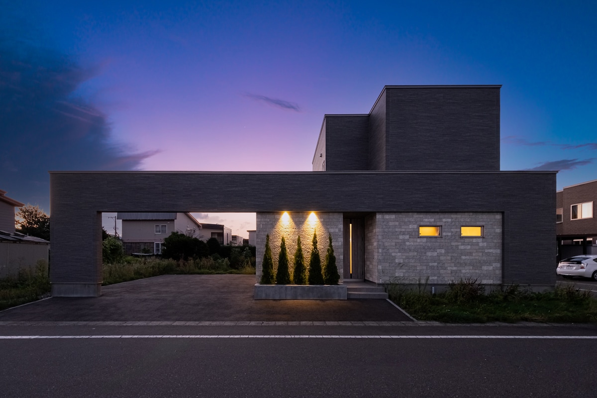 Modern & stylish private vacation home with 2 connecting units for up to 6 people. Overlooking the Daisetsuzan mountain range, close to Furano, Biei, Asahidake, Asahiyama Zoo, Ski Fields. 3 BR, 2 BA, 4 toilets, island kitchen, reading nook, work space, dining area, lounge, storage room, 1 queen & 4 twin beds, jet bath, washer/dryer, free parking, free WiFi, air conditioning, underfloor heating, outdoor terrace with stunning views. * See below for May-Sep 2026 rice field Reconstruction notice *