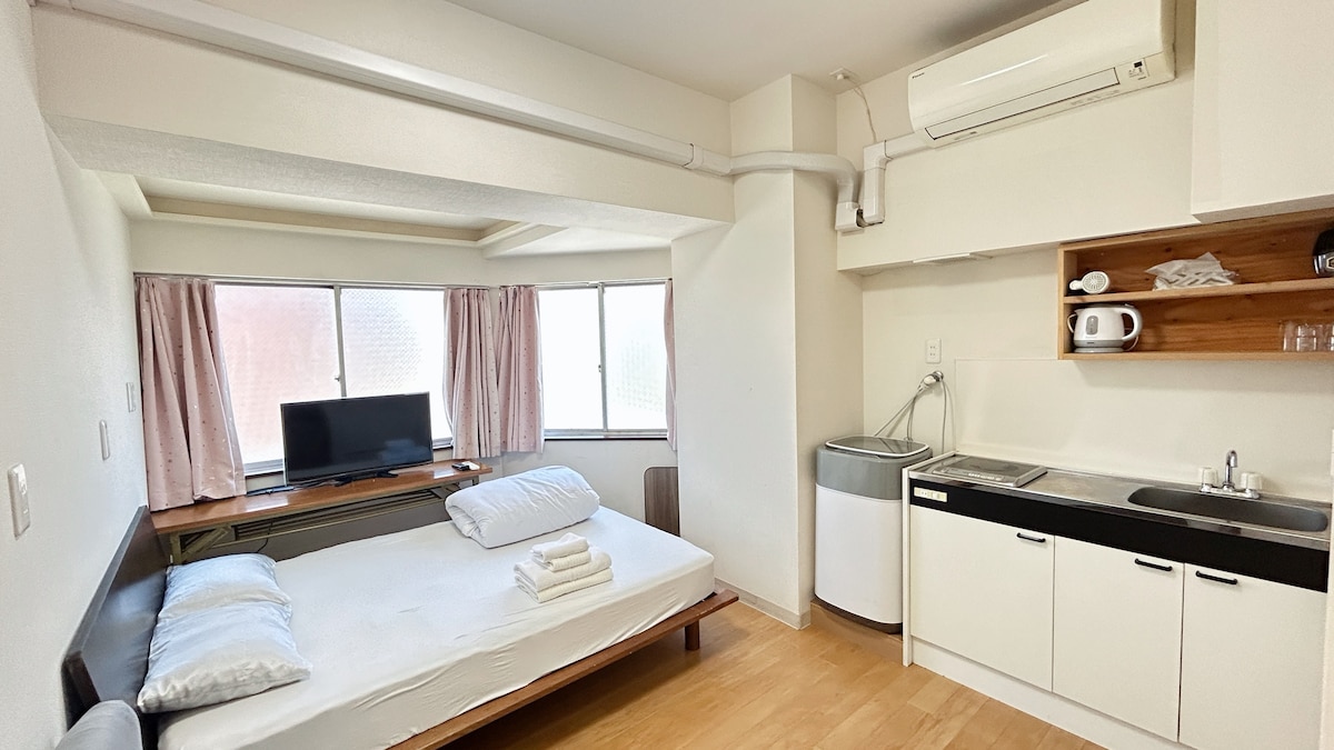 入住這間位處中心地段的房源,全家到哪都方便。 房內配置兩張加大雙人床,適合家人、朋友一同入住。 床距舒適,動線保有獨立空間。最多可住5人。 開放式廚房備有電磁爐、鍋具與碗盤,想吃家常菜、日式簡單料理都不是問題。 吧台連接生活與用餐空間,不論是一杯早晨咖啡,還是一頓晚餐,一切都剛剛好。 洗手台與衛浴獨立設計,幾個人一起住也能保有自己的步調。 提供藍芽音響,在日本的夜晚聽著音樂、泡個熱水澡是旅途中最放鬆的片刻。 房內備有投影機,可輕鬆連接常用的數位串流平台。 洗衣機、空氣清淨機、熨斗與寬敞衣櫃一應俱全,你需要的,我們都準備好了。 空間剛剛好,適合一個人靜靜地在吧台工作,也適合和朋友或家人一起住上幾天。 自在相處,各自舒適。