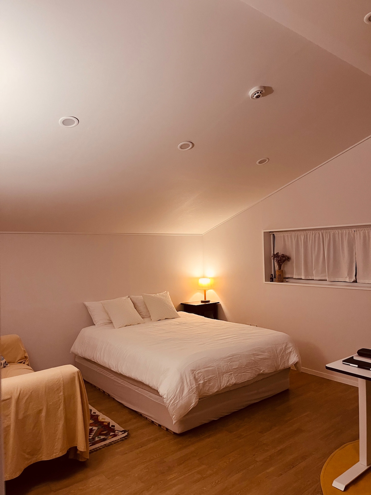 位于神井湖畔的独特小屋 这座别致的农舍位于牙山市神井湖旁,经过精心改造,融合了温馨与时尚。牙山市有丰富的旅游资源,如Pinnacle Land、公世里圣堂、外岩村、民俗博物馆、温泉和灵仁山滑索等。距离小屋仅100米的神井湖于2025年被指定为忠清南道首个地方庭园公园,是全年适合散步和慢跑的地方。湖周围还有许多餐厅和咖啡馆,让您尽享城乡结合的独特魅力。 这间小屋与房东居住的区域(A区)位于同一栋建筑内,通过一扇开合门分隔,确保互不干扰。客人专属的B区拥有独立的入口以及连接果园的露台。露台设有凉亭,您可以尽情享受宁静的乡村氛围。室内采用开放式设计,设有大窗户、6人餐桌、两张超单人床和宽敞的沙发,为您提供舒适的入住体验。
