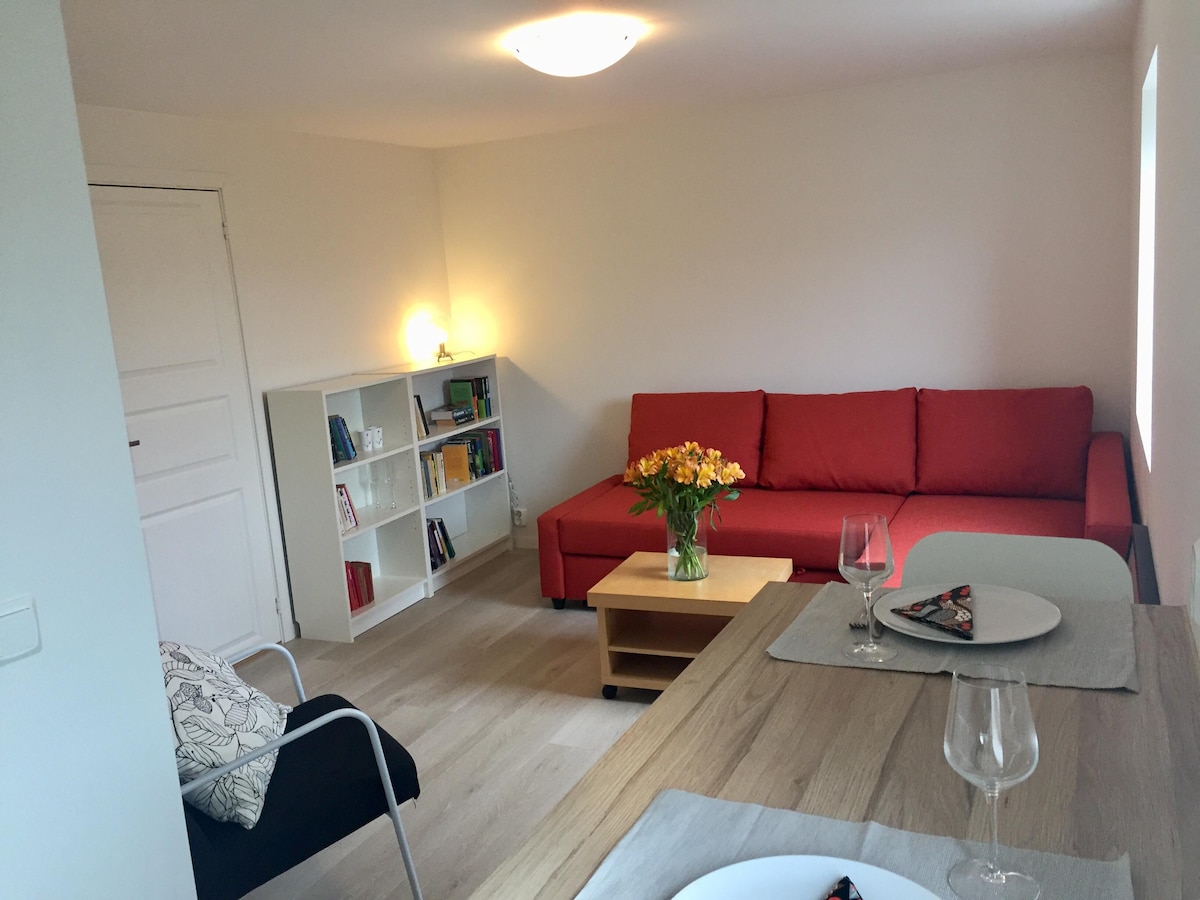 Cosy studio situated in lush Norwegian valley just 15 minutes away from the city centre. The studio has a big bathroom, small kitchenette (no hob), and a bedroom and livingroom divided by a curtain. The sofa bed in the livingroom can easily flip out as a 140 double bed.