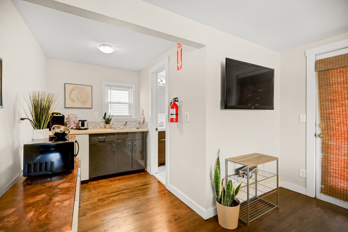 Relax and Enjoy beautiful Asbury Park in this 500 sqft open concept, modern studio apartment located in NW Asbury 1.5 miles from the beach. Enjoy a fully stocked kitchen, dishwasher & wine fridge. FAST Wi-Fi & 65” smart TV. Polished concrete floors, separate work area for working remotely, Queen sized bed and large size couch complete the space. This is a quiet (!) studio apartment in a multi-family home with a shared backyard. Early Check-ins and late check outs based on avail at $10/ hr