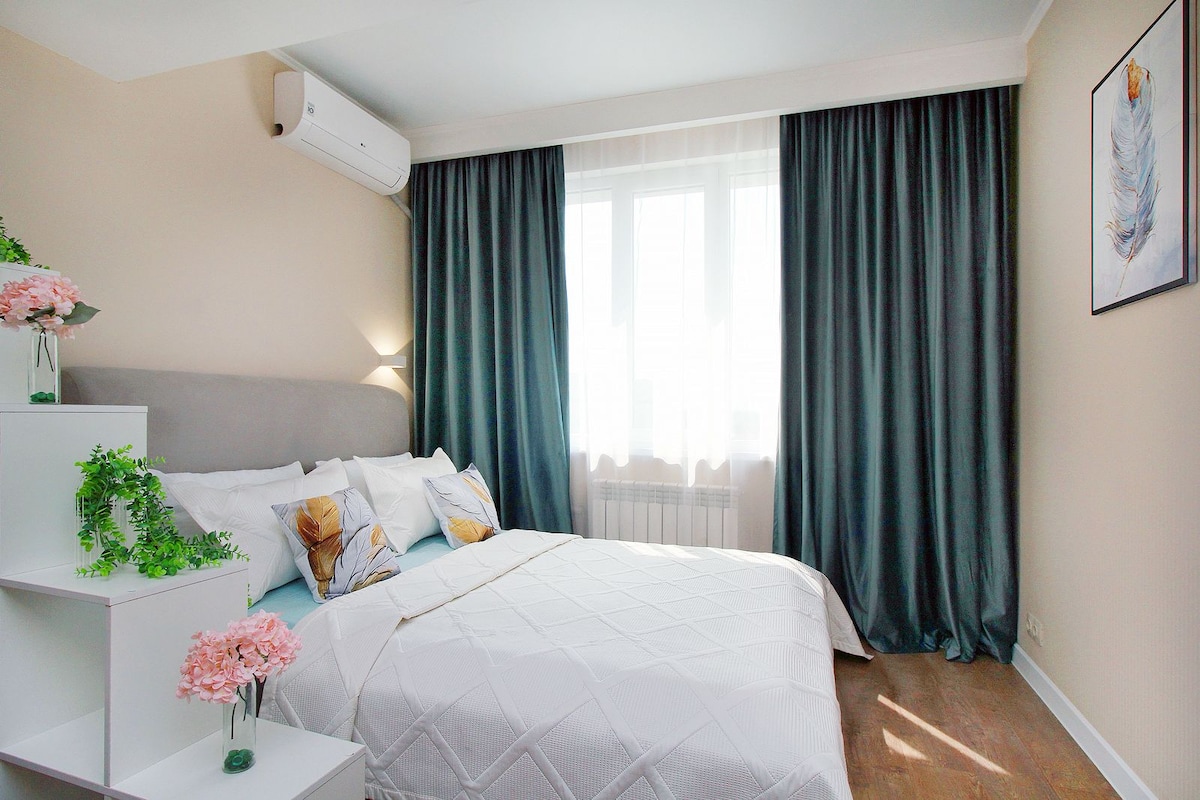 The best location to feel vibe of Almaty. The very center where everything is within walking distance! Near the shopping center, cafes, cinemas, 28 Panfilov's park, Gorky park, Zoo, Green Bazar, symphony, opera, etc. The amenities: dishwasher, washing machine, coffee machine, air conditioning, TV, 2 internet providers Kazaktelecom 500mb & AlmaTV 100mb, iron and SMART-LOCK. Towels and shower accessories are provided for all guests.