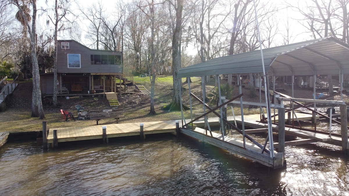 The Cajun Chateau is the perfect rustic get-away! This cozy camp is filled with huge amenities. With river front views, a huge screen porch, and enough sleeping space for 6, this home is off the beaten path in a quiet subdivision accessible only by golf cart or boat (golf cart provided). Your Cajun adventure can begin at the Cajun Chateau!