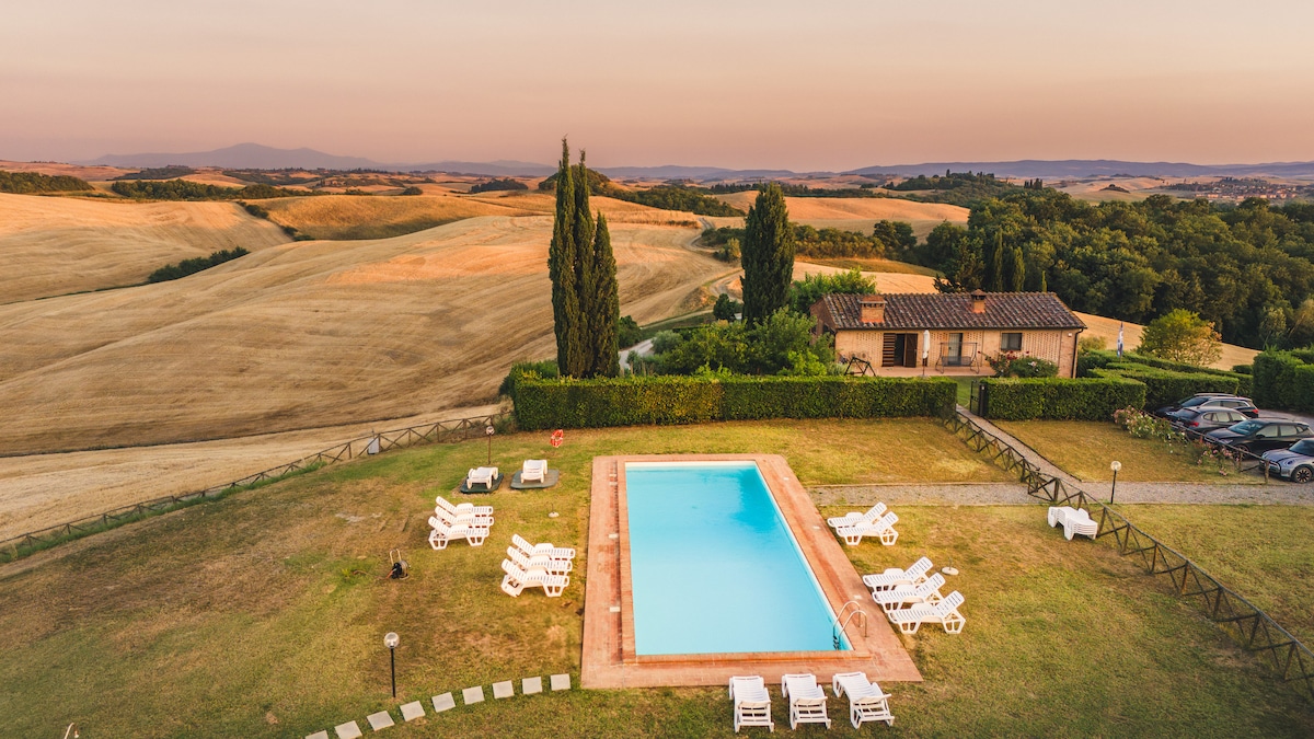 Huge and charming top floor apt in Tuscan Villa with breathtaking view! Visit Montepulciano, Pienza, Siena, explore country side, vineyards and hot springs, hiking or e-biking, strolling or driving! Two roomy suites with top quality beds and bathroom ensuite. Windows walled living room, comfy sofas, professional kitchen at your own use. We can set Winery visit & tasting, Cooking classes and private dinners. NEW Hot tub facing green hilltop! ExperienceTuscany as a local, with your local Host!
