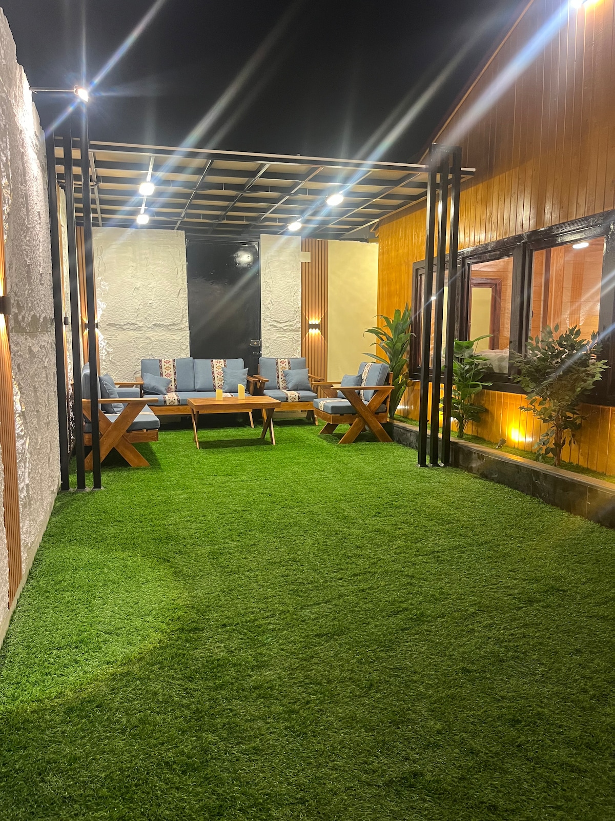 إطلالة جميلة على المزاع يحتوي على ٣ غرف نوم وصالة ومطبخ متكامل يحتوي على مايكرويف وفرن وغلاية وثلاجة و أدوات طبخ الكوخ مكيف بالكامل يحتوي على جلسات خارجية