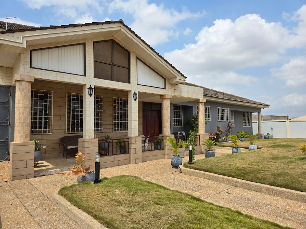 3 bedroom apartment with style at Lashibi, on klagon Road. It's a tranquil place that has luxurious furnishing. The distance from the airport is roughly 28 minutes. The property is gated and monitored by CCTV 24 hours a day, seven days a week. The house has three bedrooms, which boasts of a 2 bedrooms ensuite bathroom, spacious living room, Tv, Netflix as well as free parking.