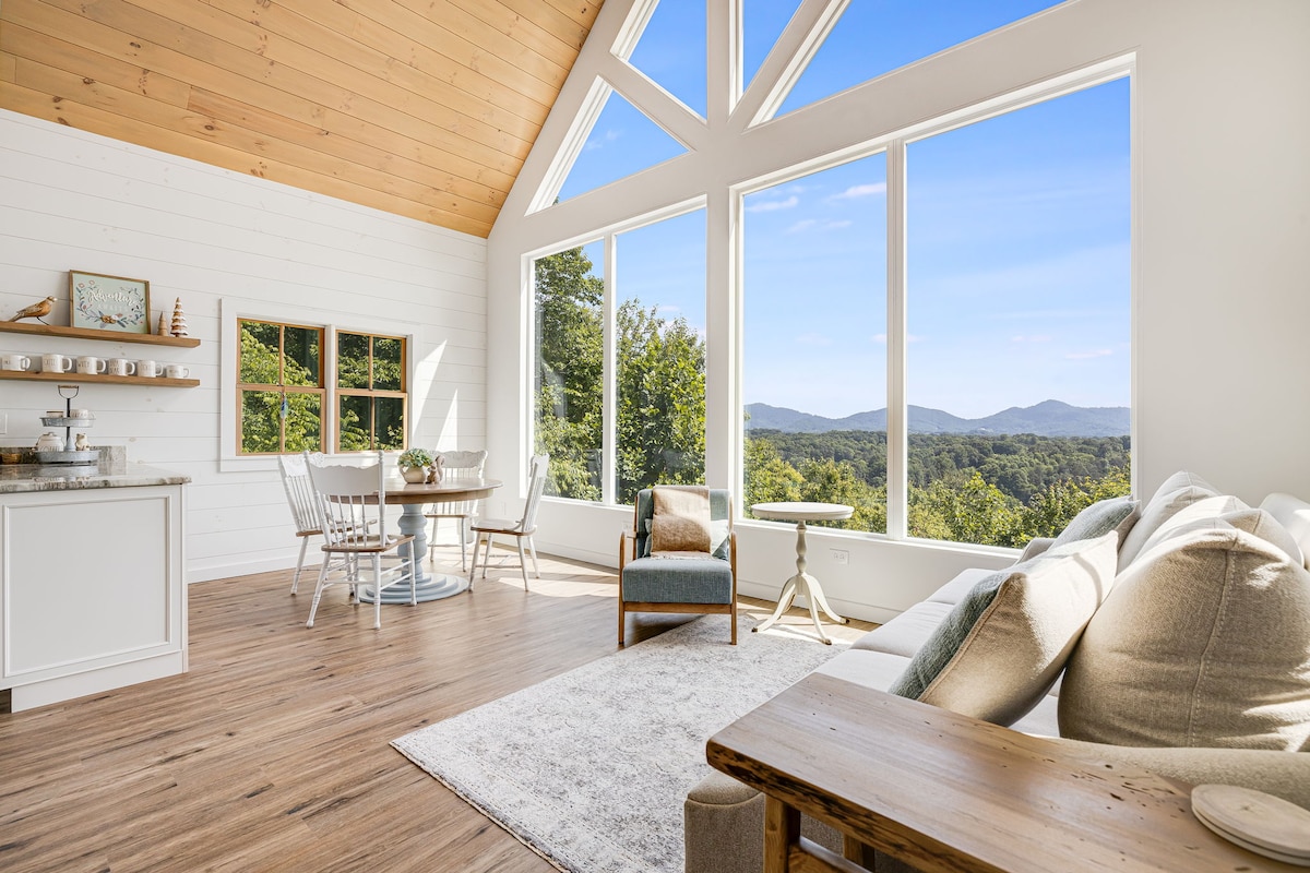 Kick back and relax in this calm, stylish space. Escape to serenity at our mountain top cottage, 20 min to Asheville. Embrace panoramic mountain views from every corner of this charming retreat. Unwind by the outdoor firepit, roasting s'mores under the starlit sky. Enjoy al fresco dining with a backdrop of breathtaking sunsets. This cozy cottage sleeps 4, perfect for a family or friends seeking tranquility and nature's embrace. Experience the essence of mountain living in comfort and style!